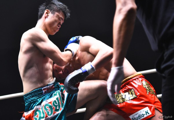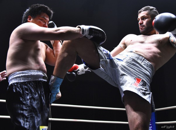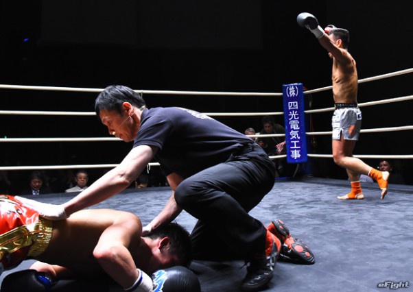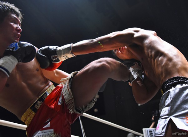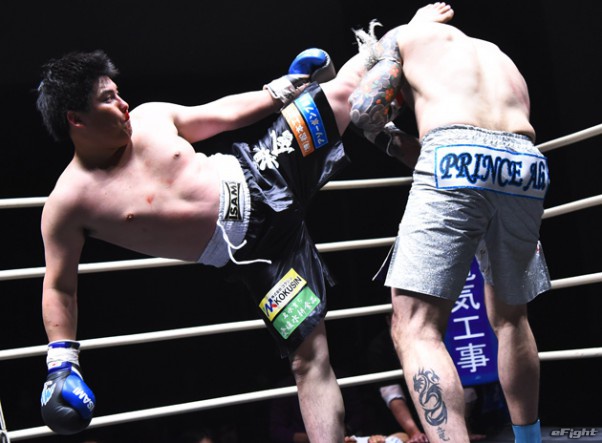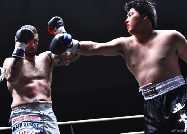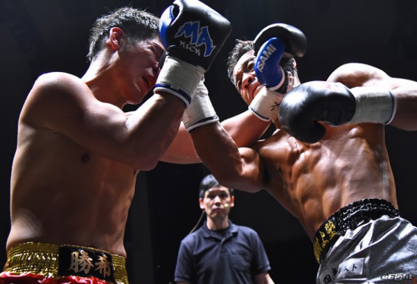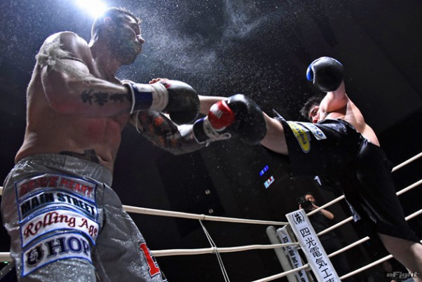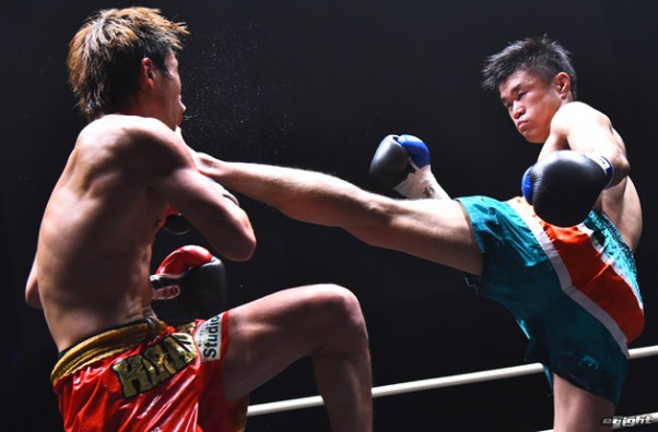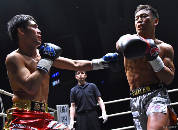 格上のプリンス・アリ(左)から左ハイでダウンを奪い、逆転勝利した山下力也(右)