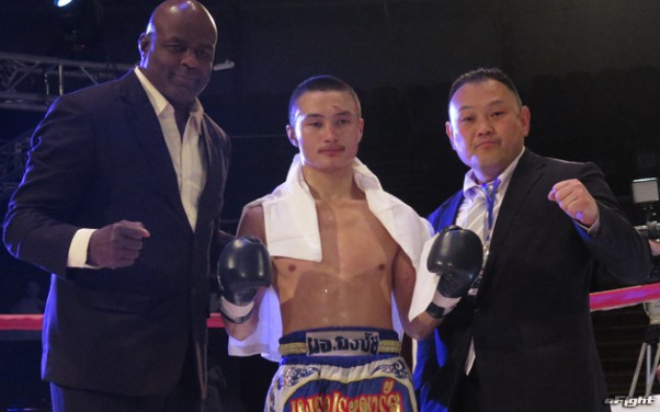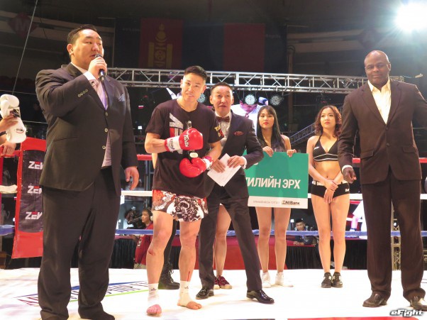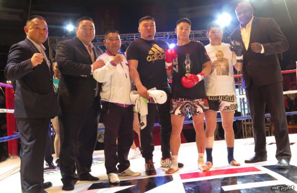 64kg級準優勝のバットゲレル(中)を祝福するアーネスト・ホースト(左)とホーストカップ・土居龍晴代表(右)