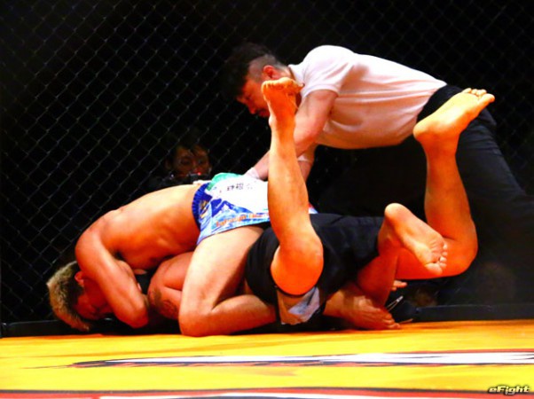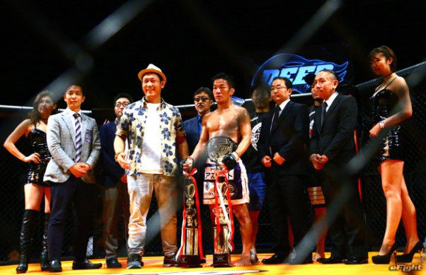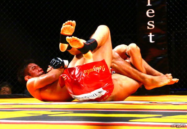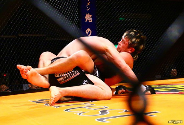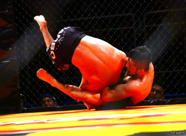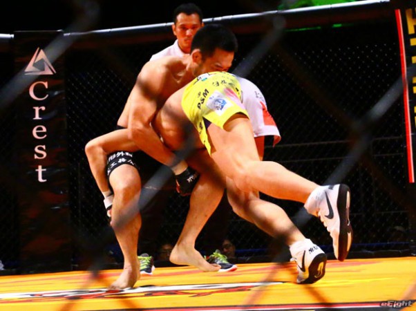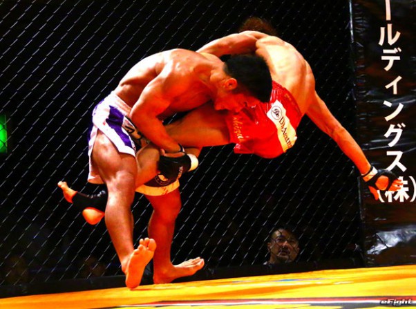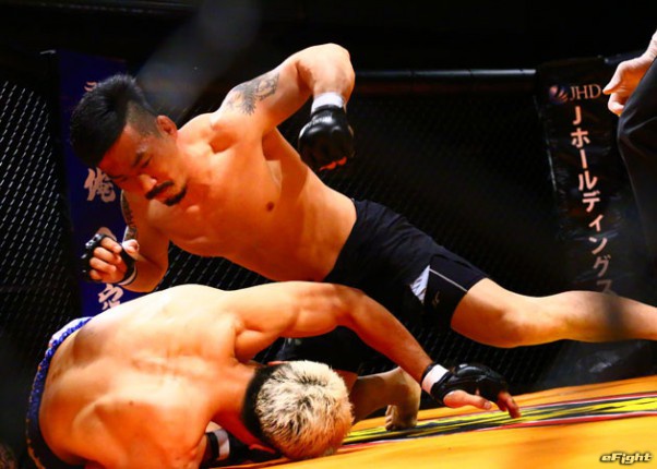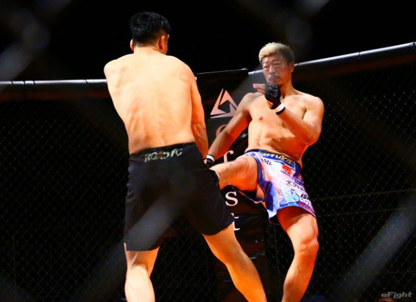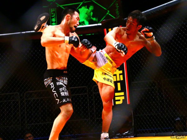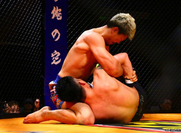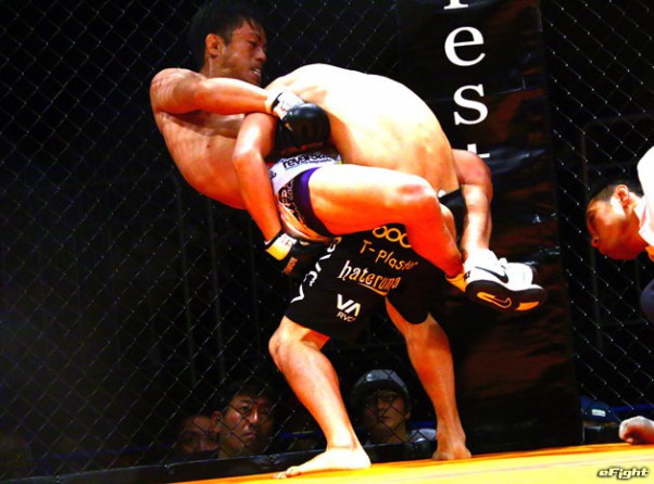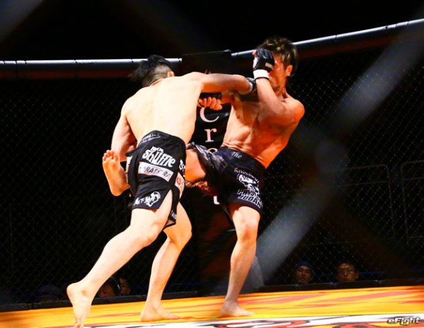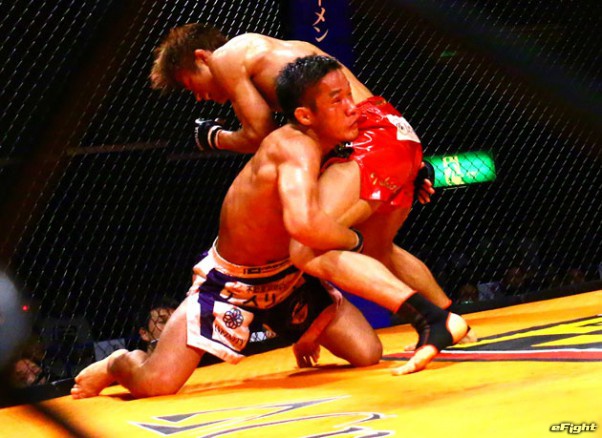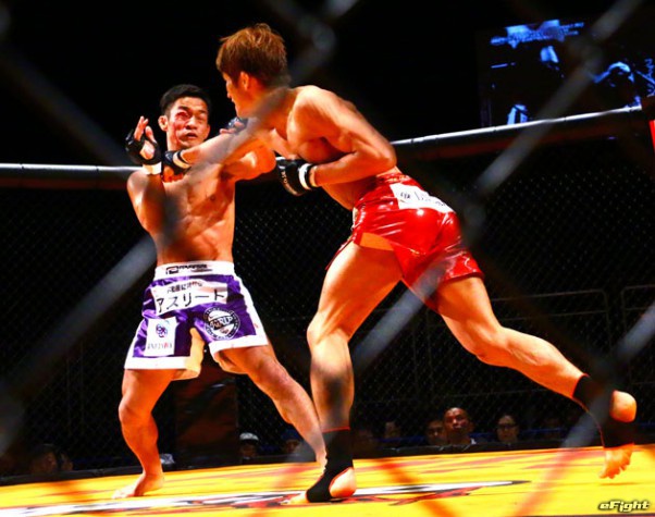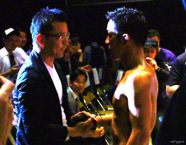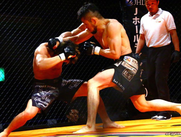 持ち前のパワフルなパンチでランボー(左)を圧倒する越智(右)