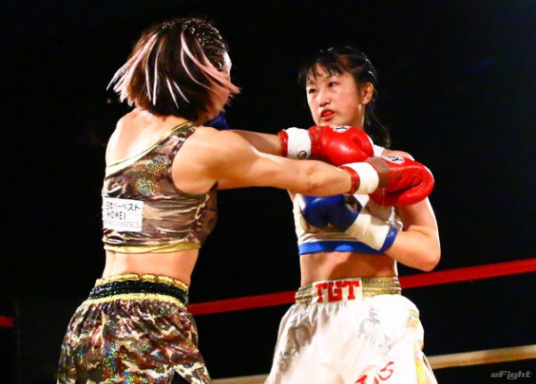 蹴り技を得意としている寺山(右)だが、パンチの打ち合いで前に出る姿勢を見せた