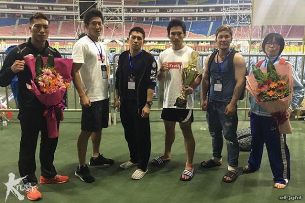 対抗戦に出場した日本チーム。Krush-63kg王者・佐々木大蔵(右から3人目)が勝利し、一矢報いた