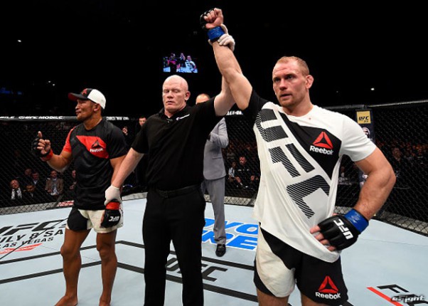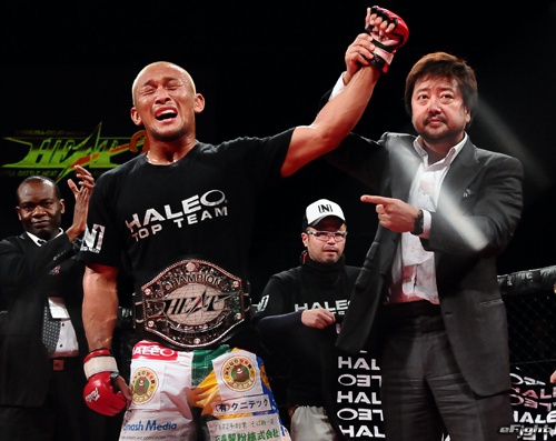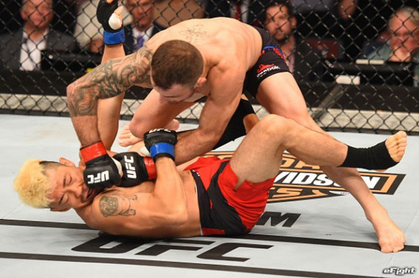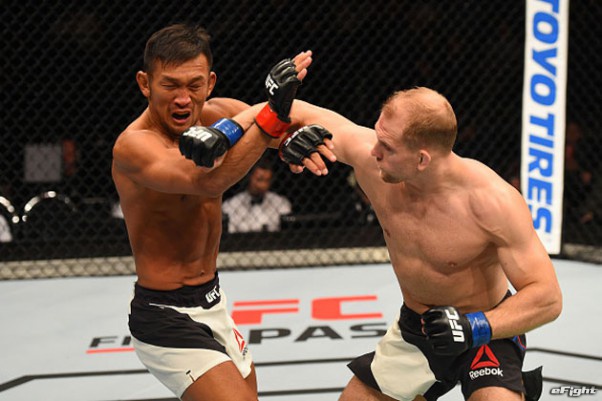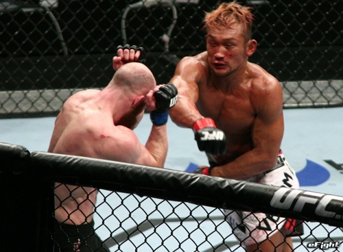 オットー(右)のパンチをもらう国本(左)。約2年半ぶりの復帰戦を勝利で飾れなかった