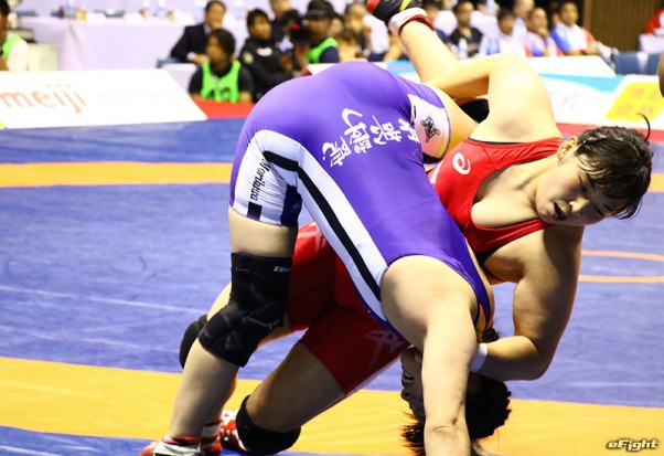 バックを取りながら森川に投げを仕掛ける土性沙羅(右)