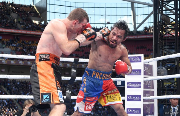 9Rパッキャオ(右)はKO寸前にまで追い込んだが、その他のラウンドはホーンのアグレッシブなファイトが目立った(写真 getty/wowow)
