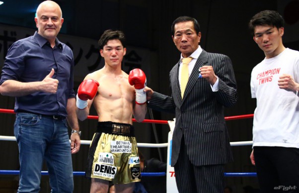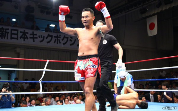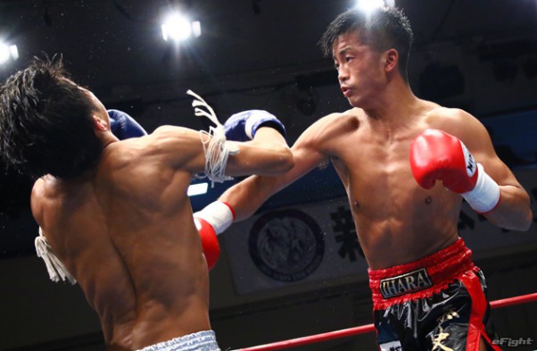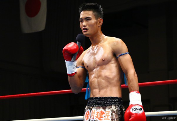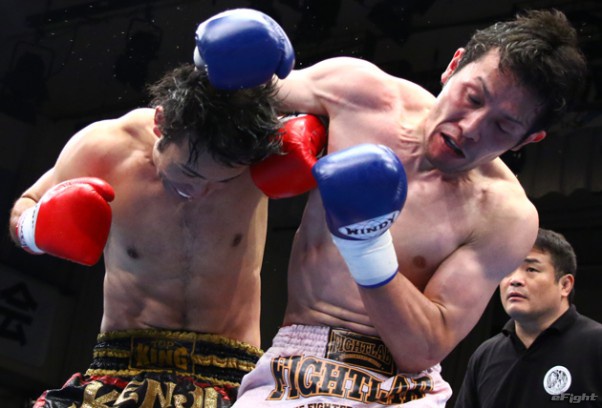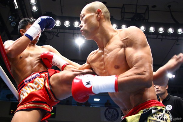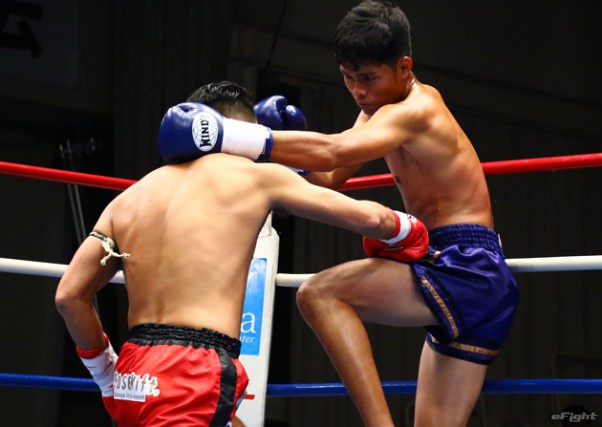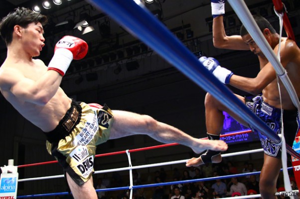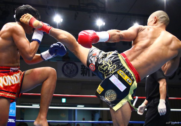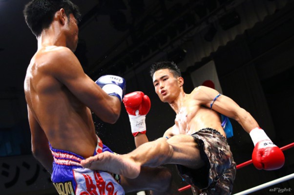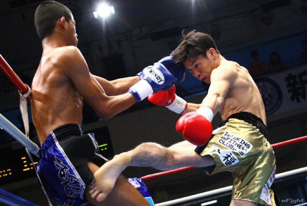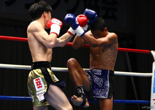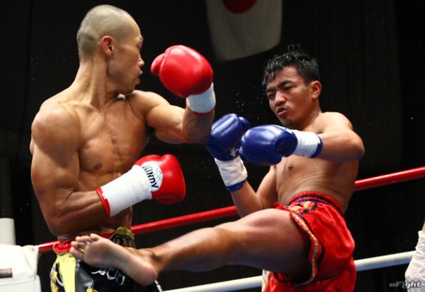 強烈な左ローで元ラジャランカーからTKO勝ちした江幡塁(右)