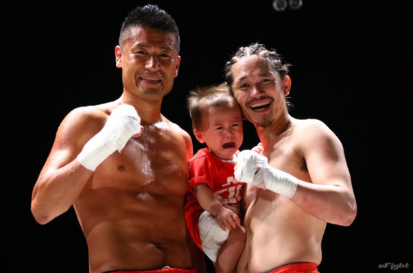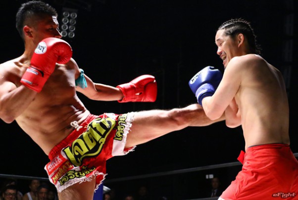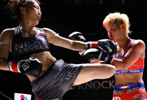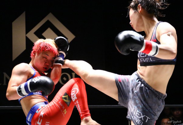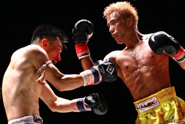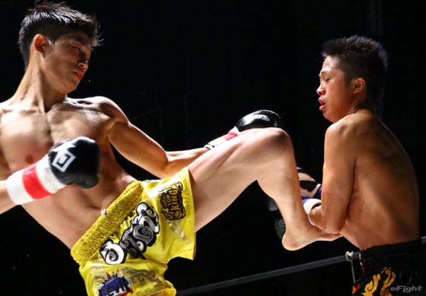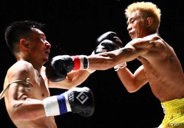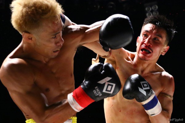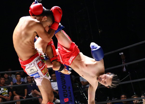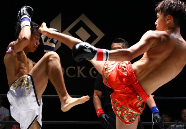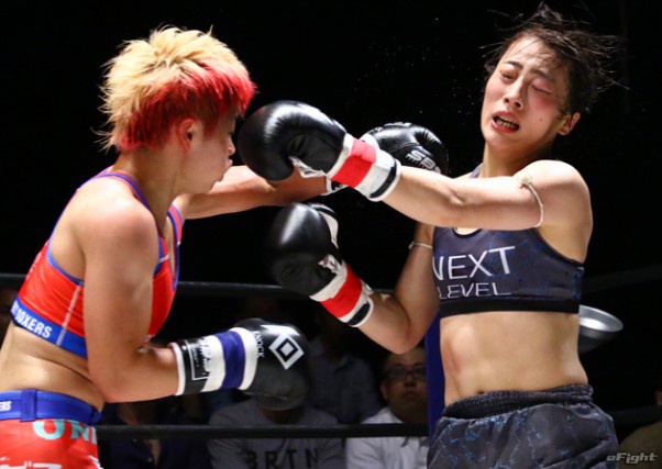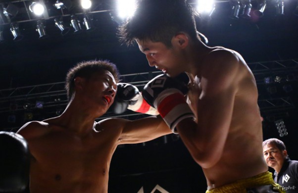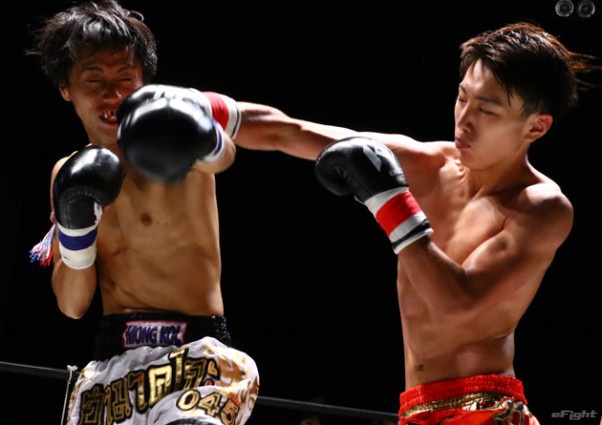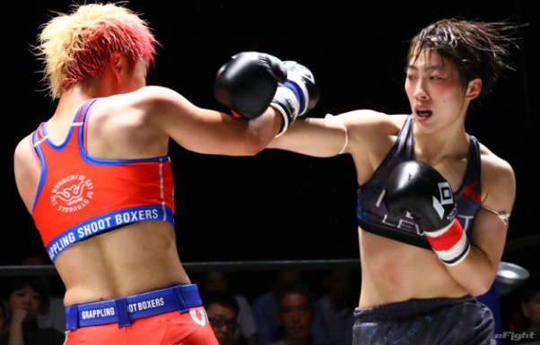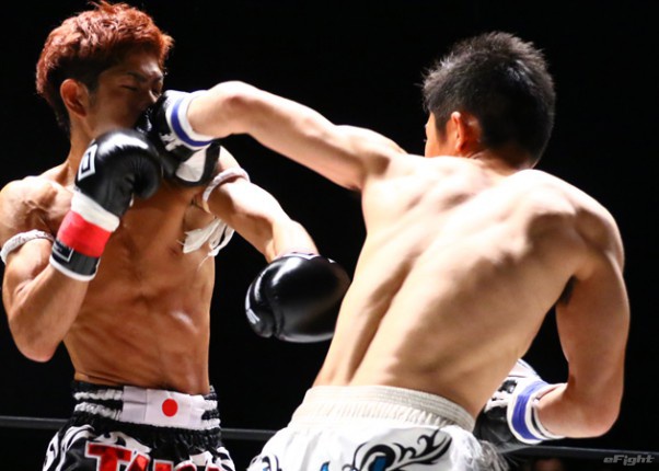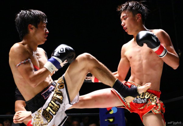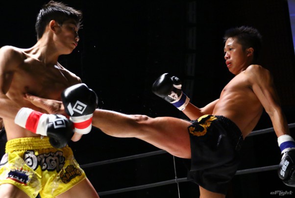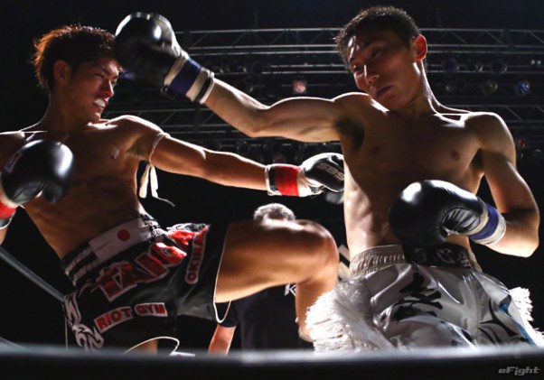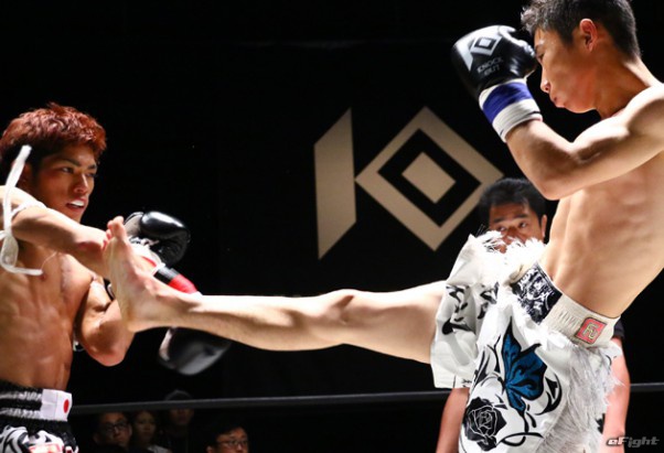 左ミドル主体の攻めを見せる安本(左)だが、パンチを被弾しドロー