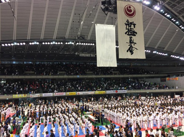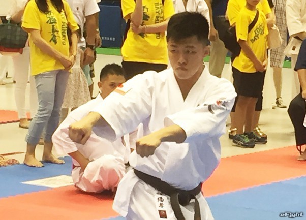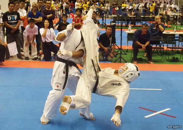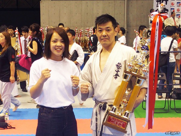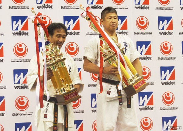 57歳にしてパワフルな組手で優勝した前澤(右)。準優勝は同門で共に汗を流す吉野(左)