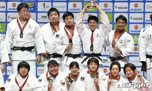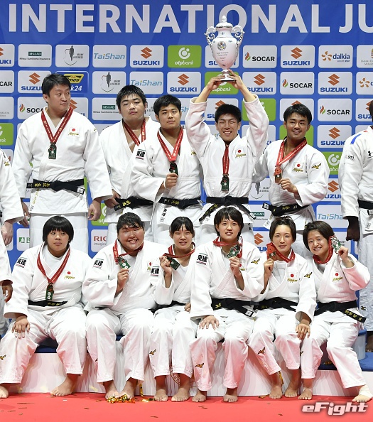 Japanese judo players celebrate on Sept. 3, 2017, after winning the mixed team gold medal in judo's world championships in Budapest by defeating Brazil 6-0. (Kyodo)