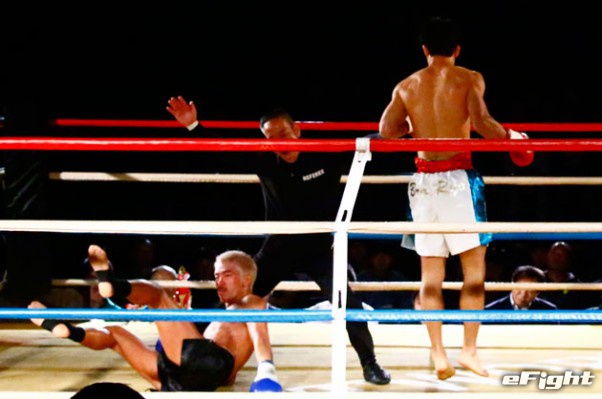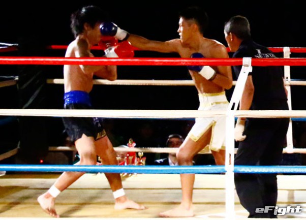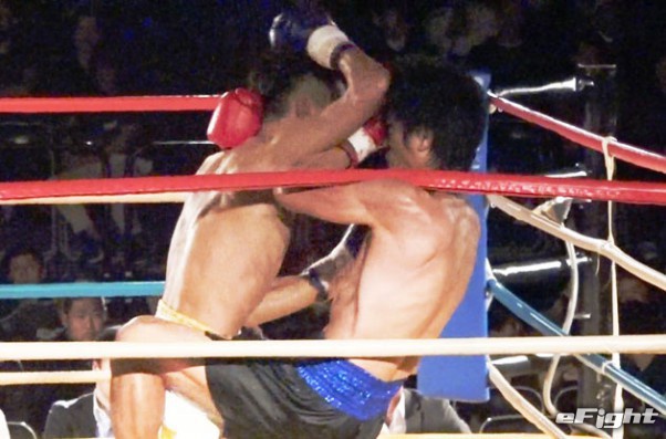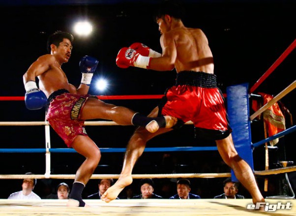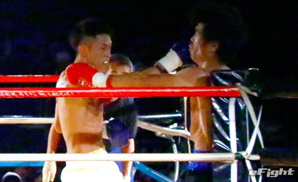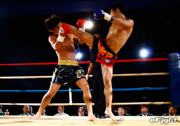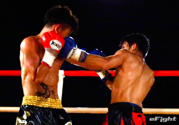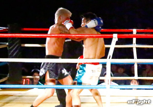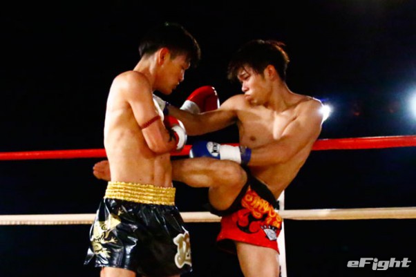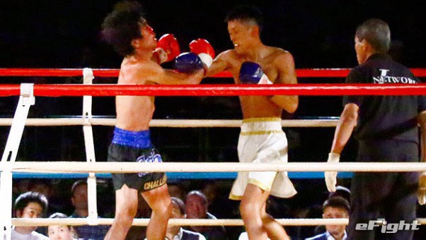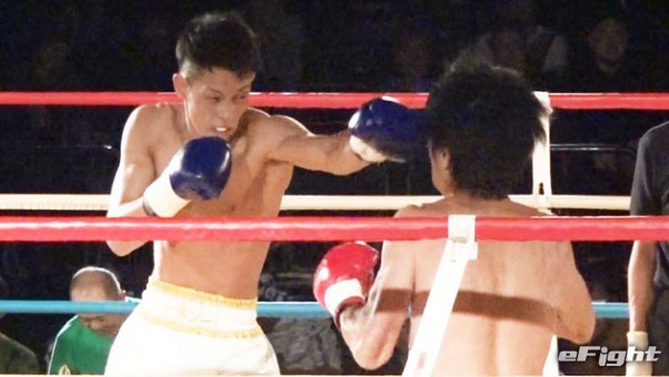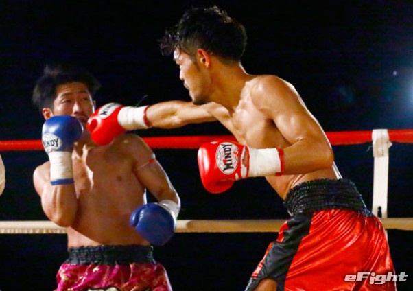 左ストレートを立嶋(右)に見舞う貞金(左)