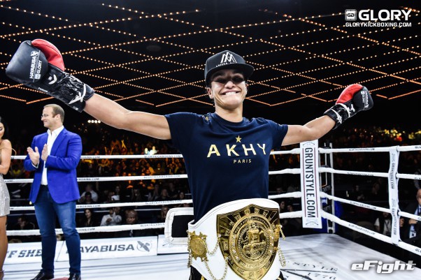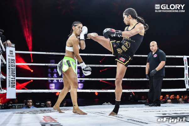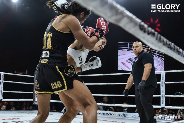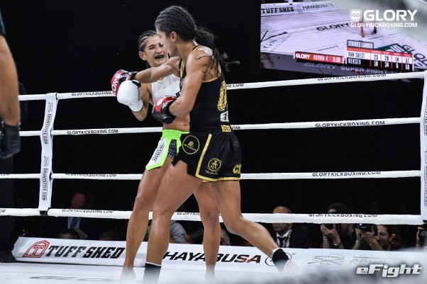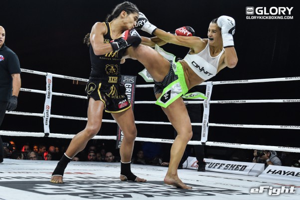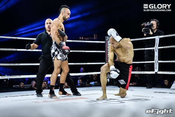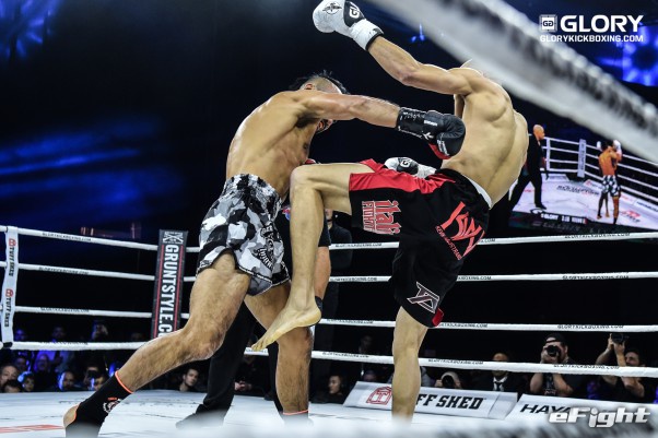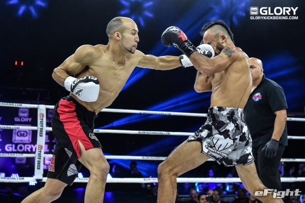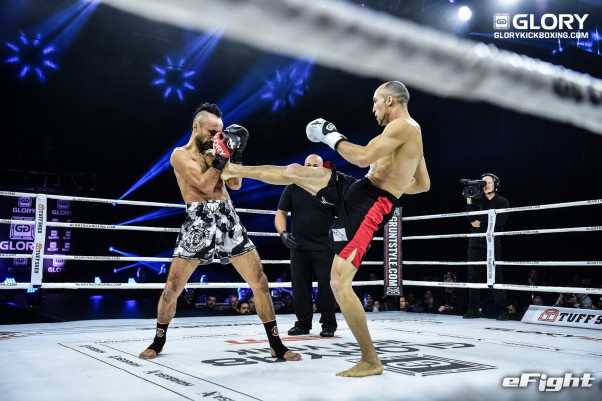 パンチで向かってくるソースト(右)を前蹴りで突き放すメクセン(左)