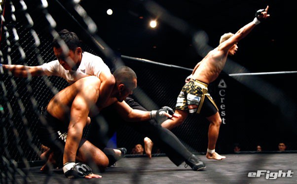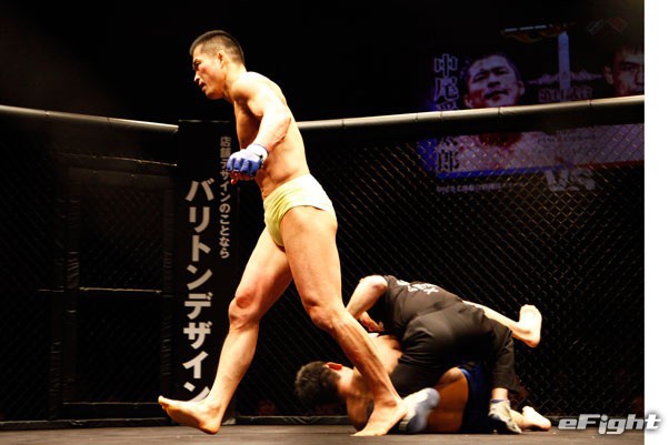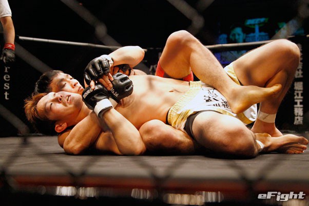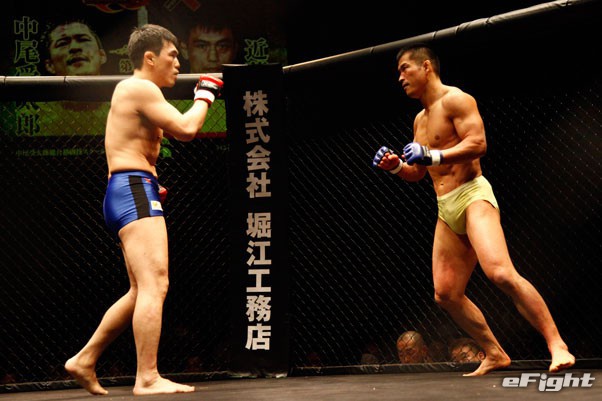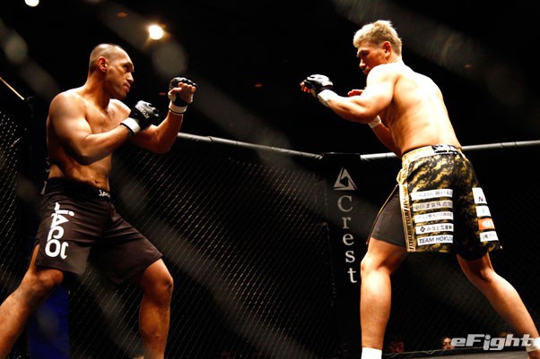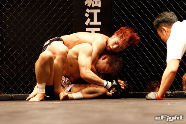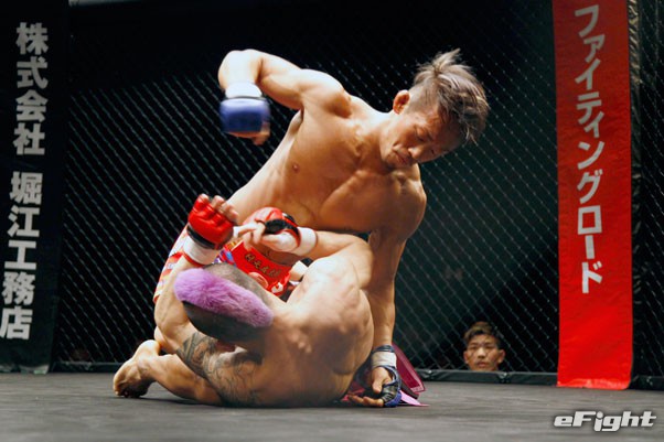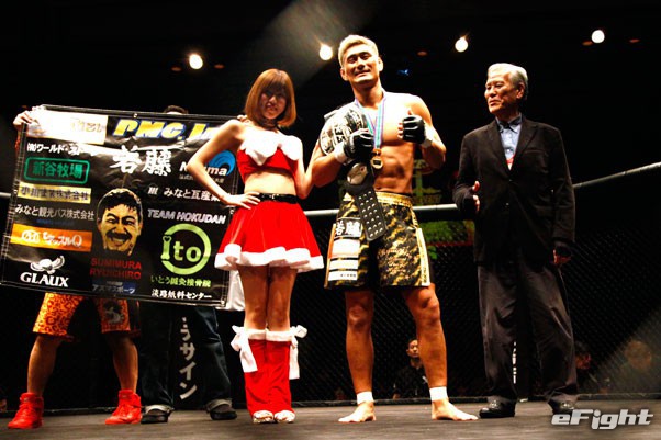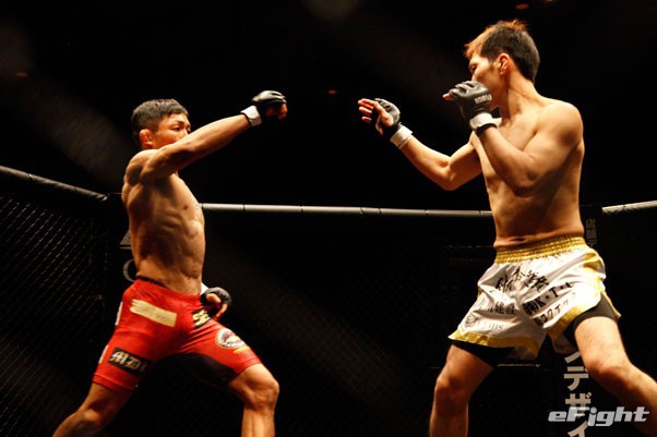 王者としての凱旋試合を1Rわずか40秒でのTKO勝ちで飾った住村(右)