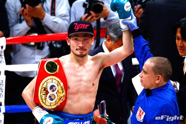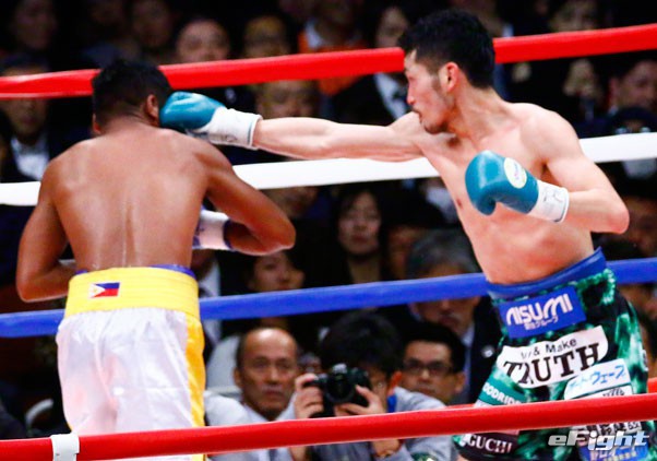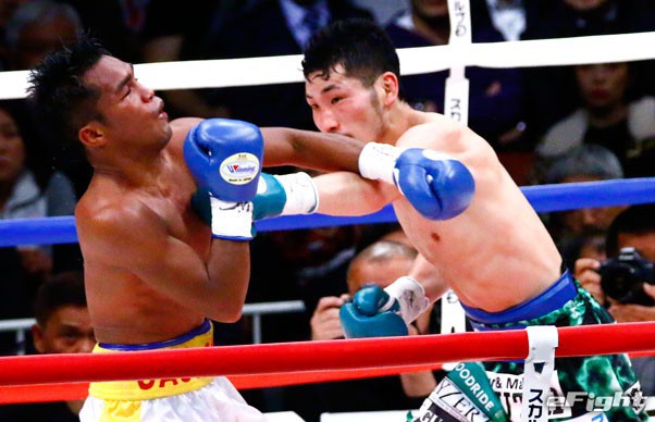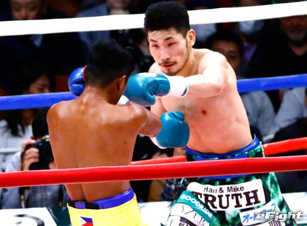 華麗なジャブから鋭い左ストレートを突き刺す岩佐(右)