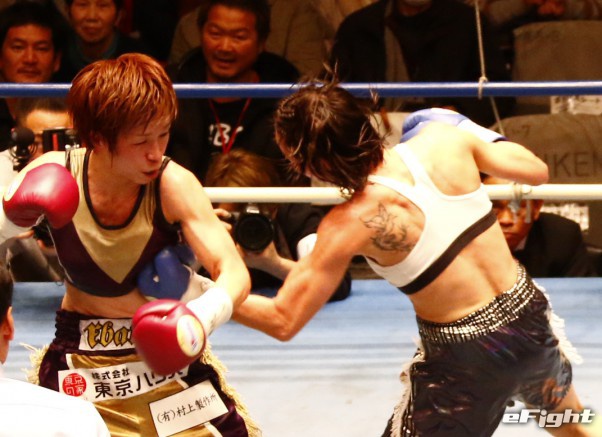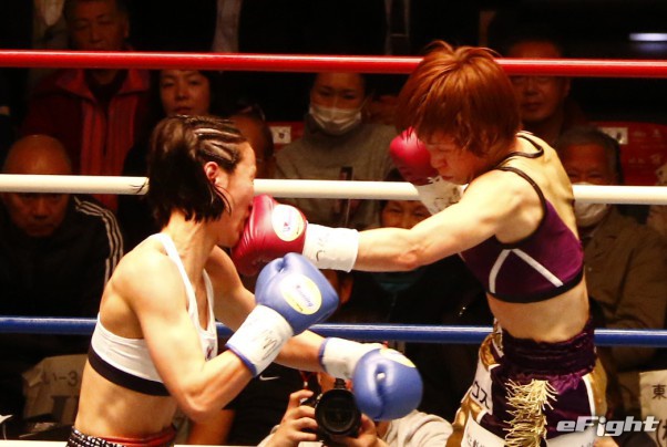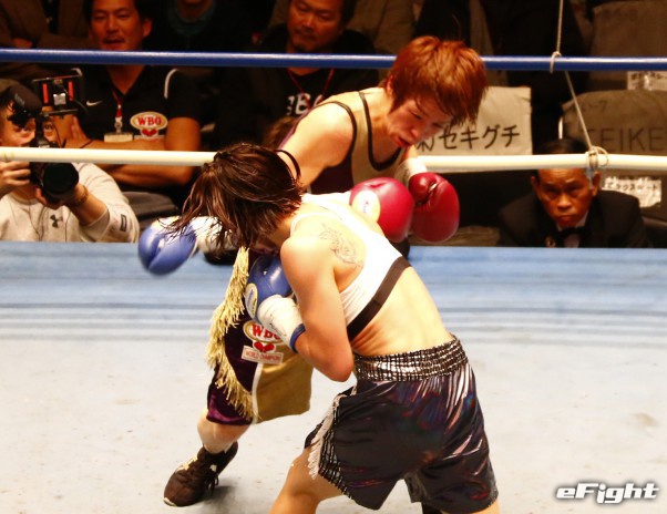 パク(右)のボディブローが江畑の腹に食い込む