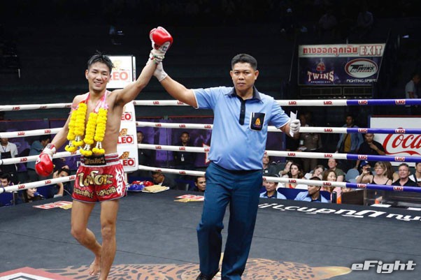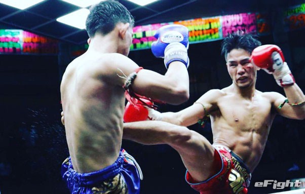 イサーンキアオ(左)に右ミドルを蹴る福田(右)