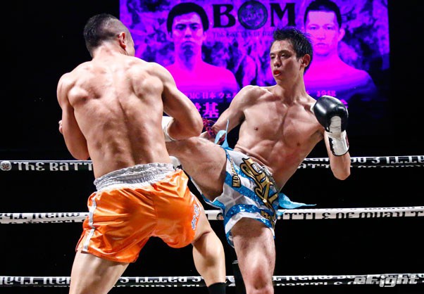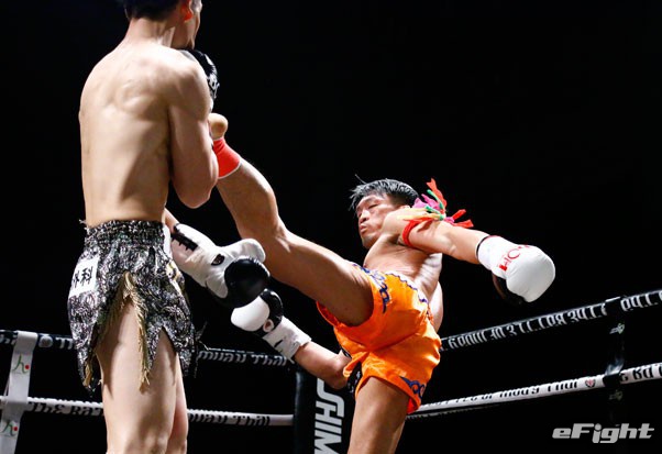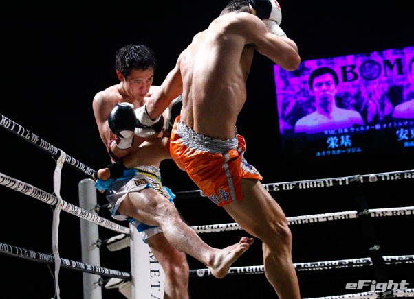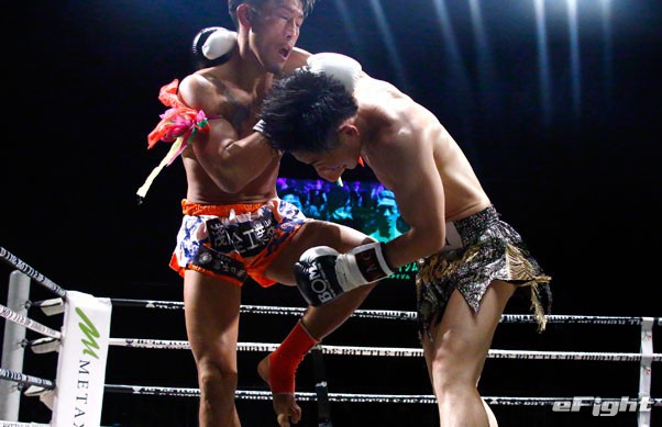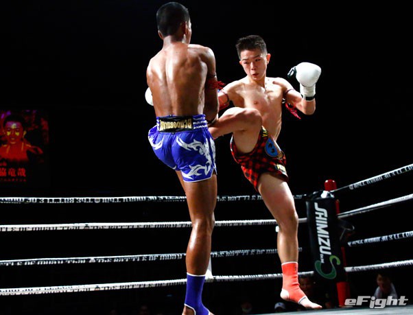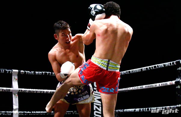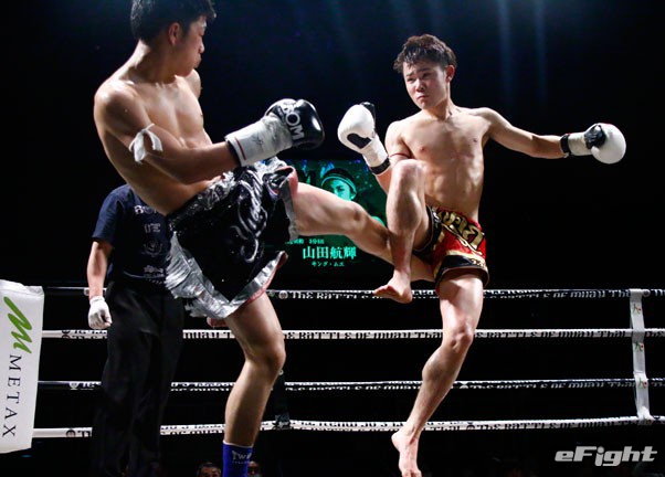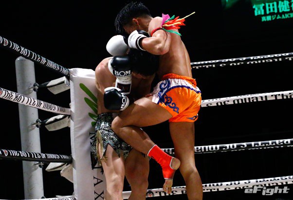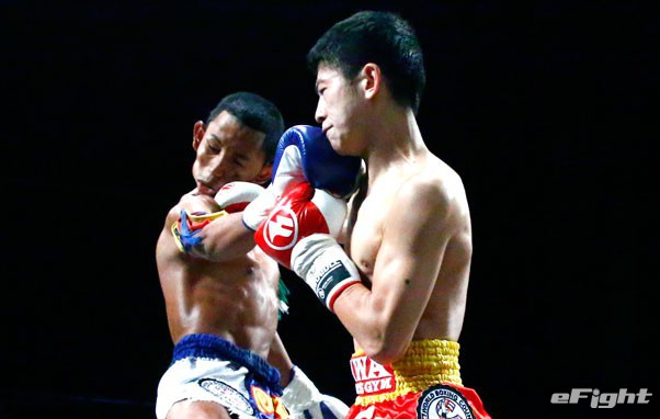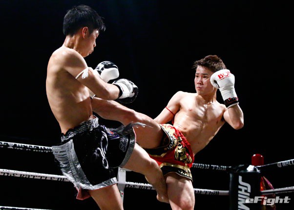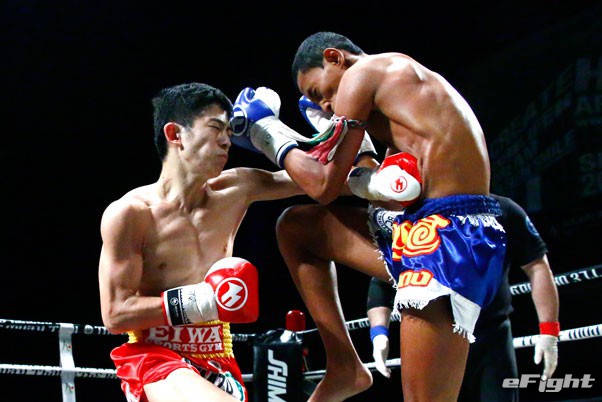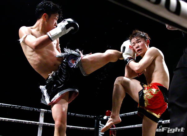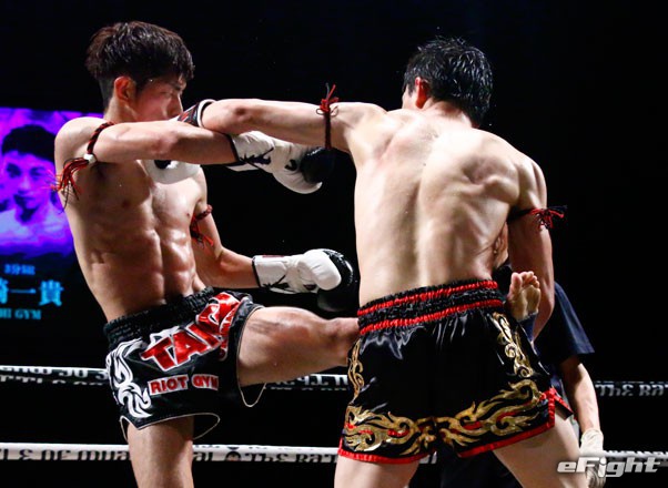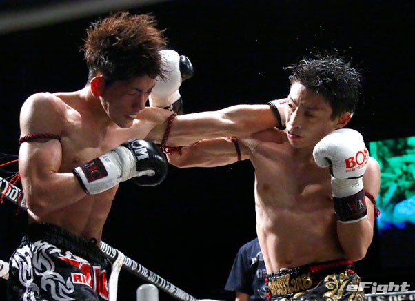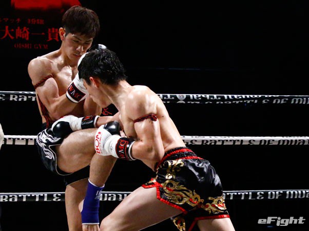鋭角的なヒザ蹴りを突き刺す奥脇(左)