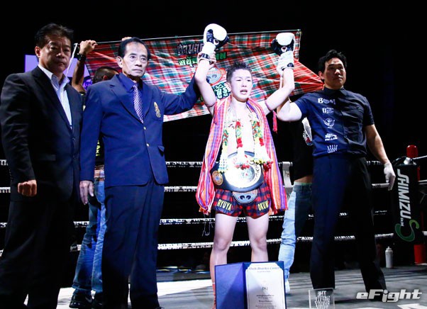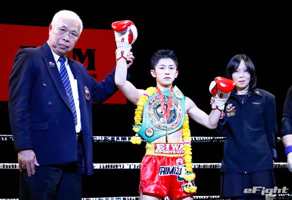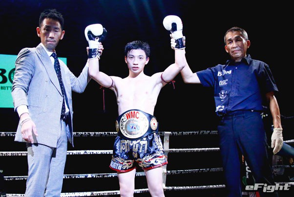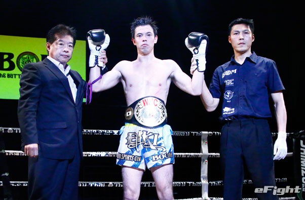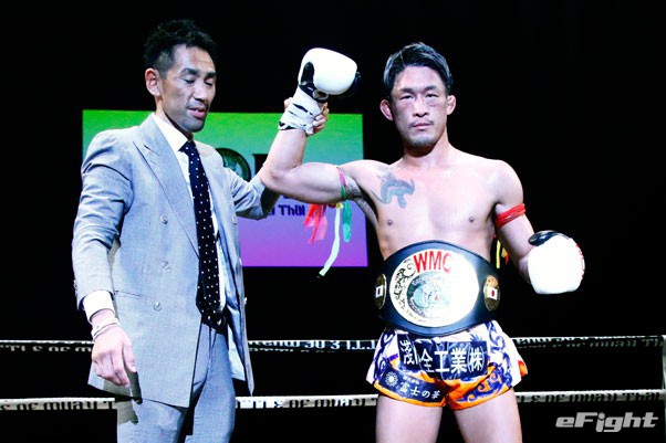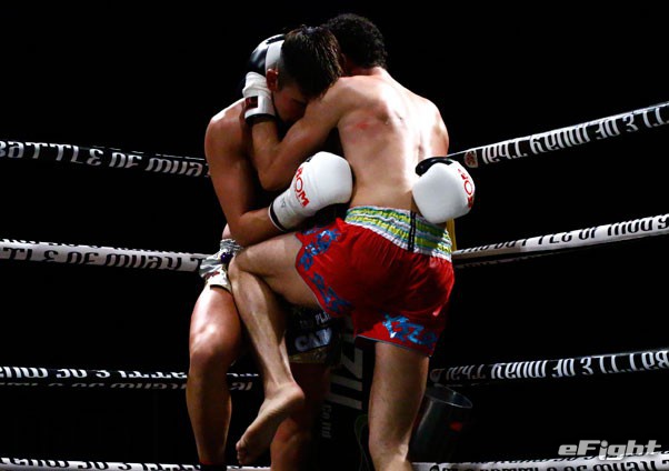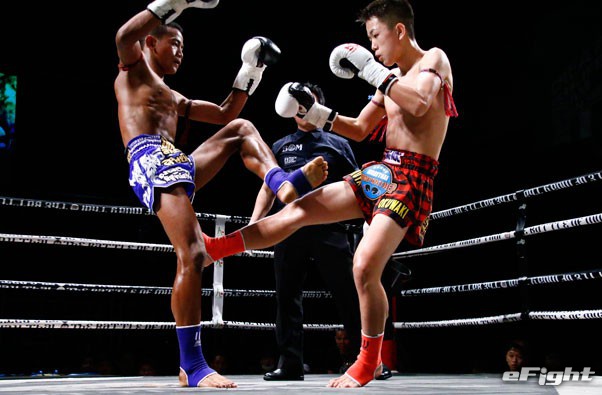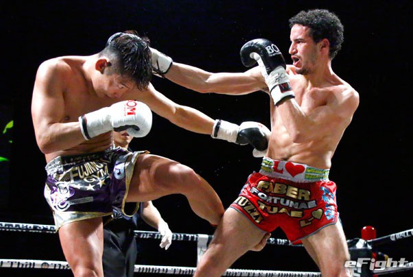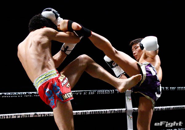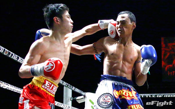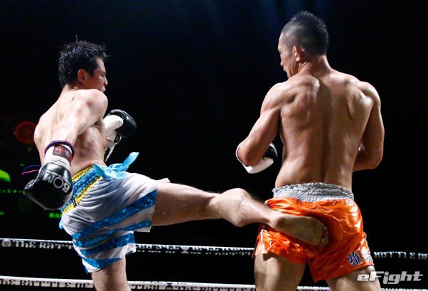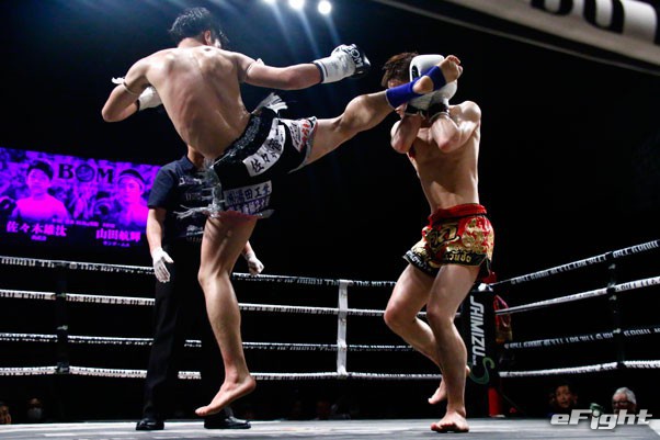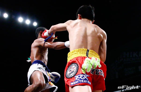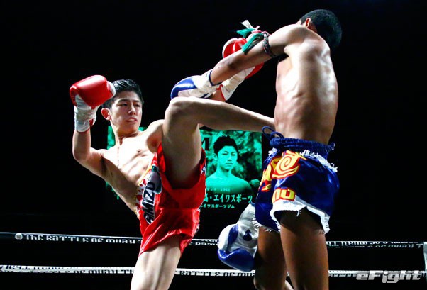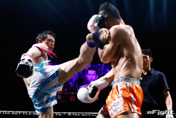 鋭角的なヒザ蹴りを突き刺す奥脇(左)