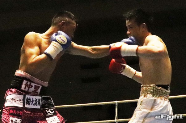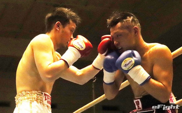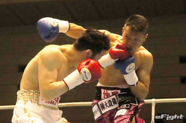 得意の左フックがクリーンヒットする辰吉(左)。