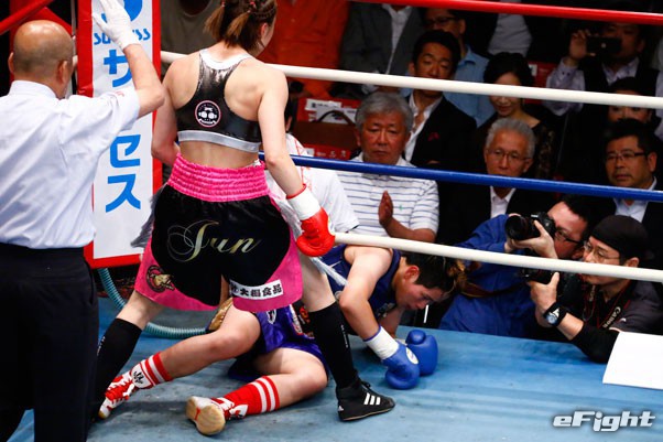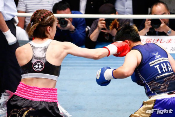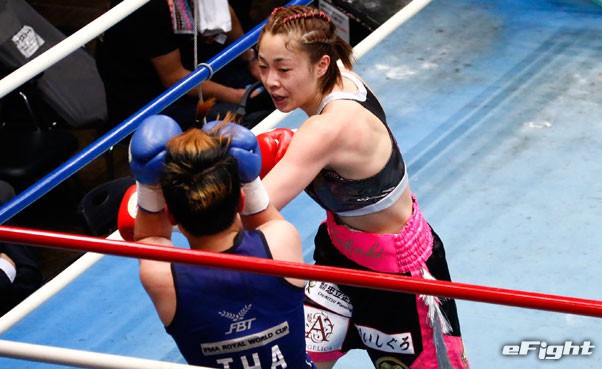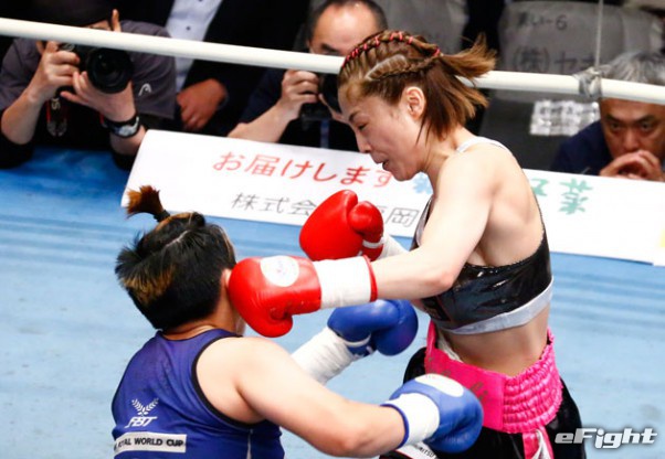 強い左を打ち込み、サオワラック(左)を圧倒する矢吹(右)