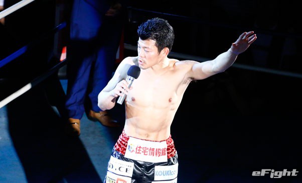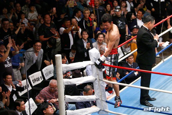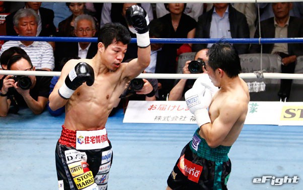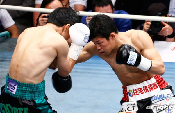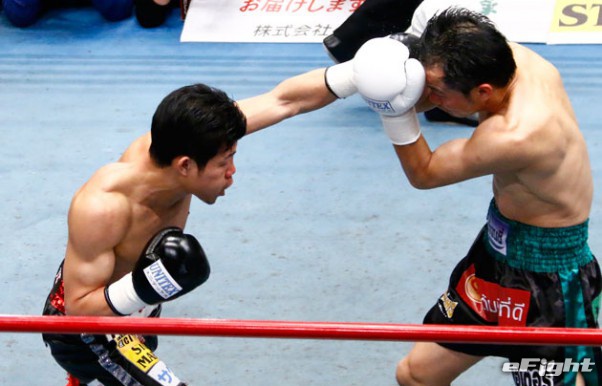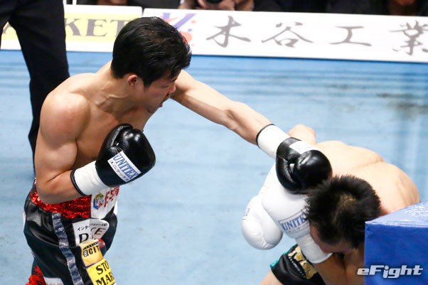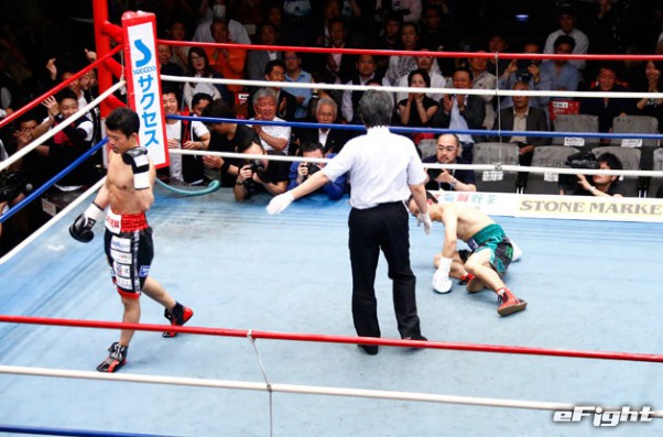 亀田(左)の左ストレートでダウンしたポンサクレック(右)