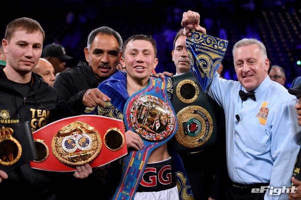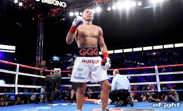 2R KOしたゴロフキン。奥ではマーティロスヤンがうつ伏せにダウンしている。(Getty Images)