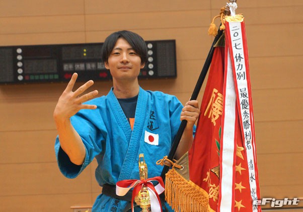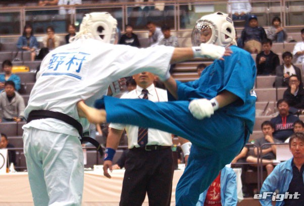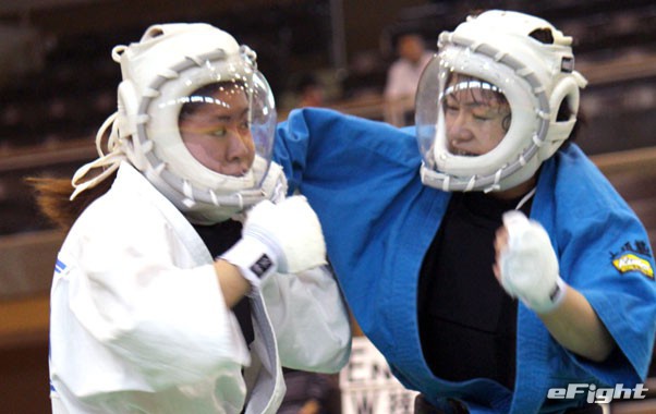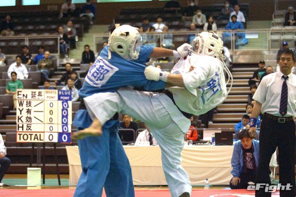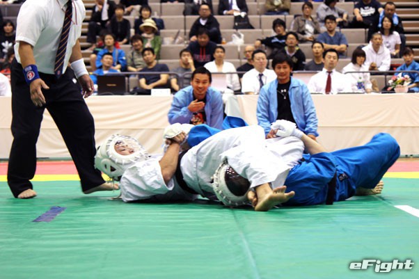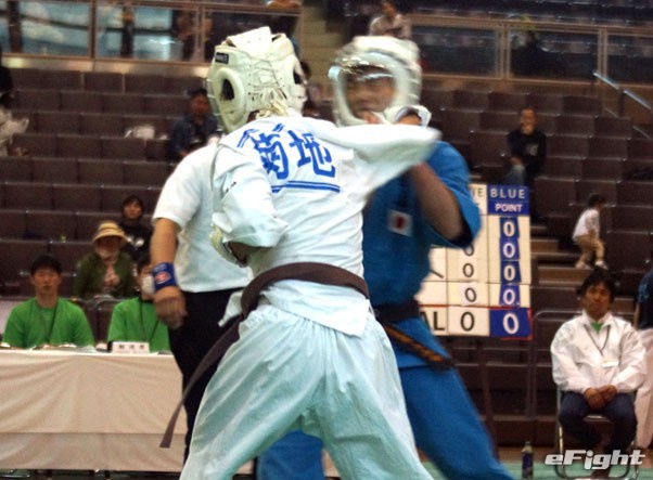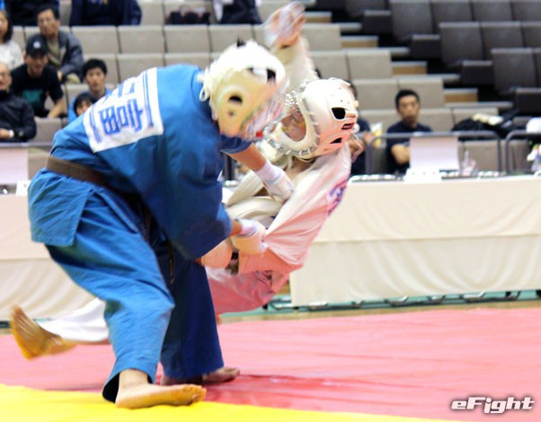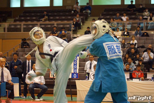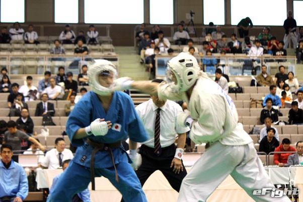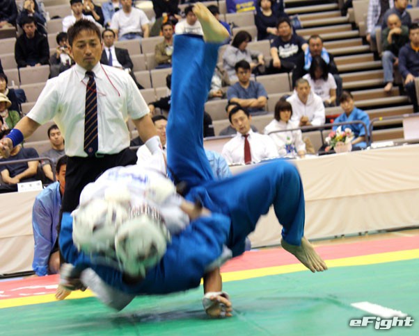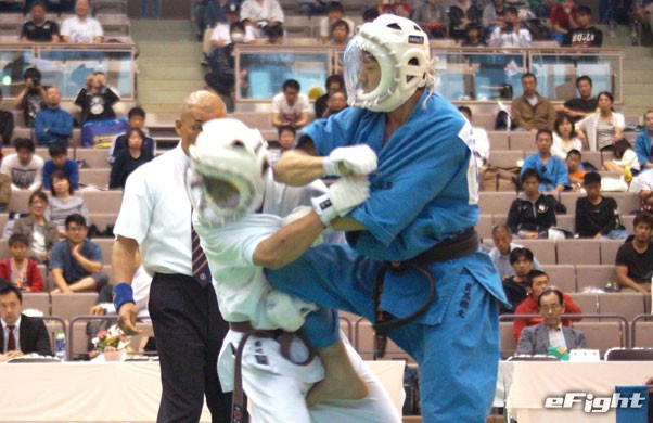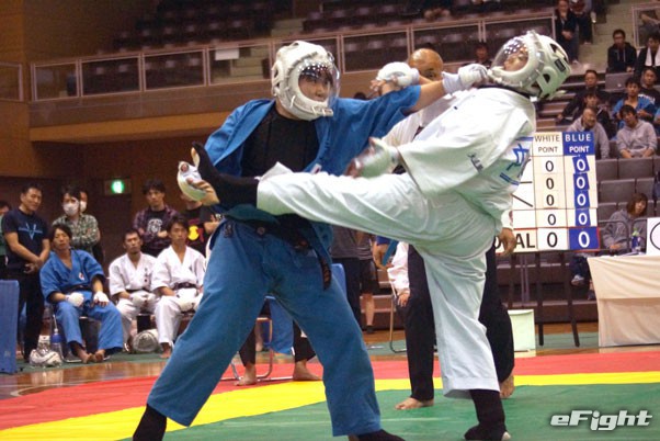 安富(青)の技が流れ、死に体となった瞬間を逃さず放たれる藤田(白)の右ストレート