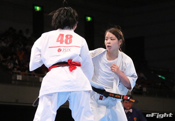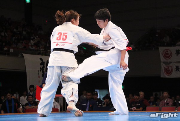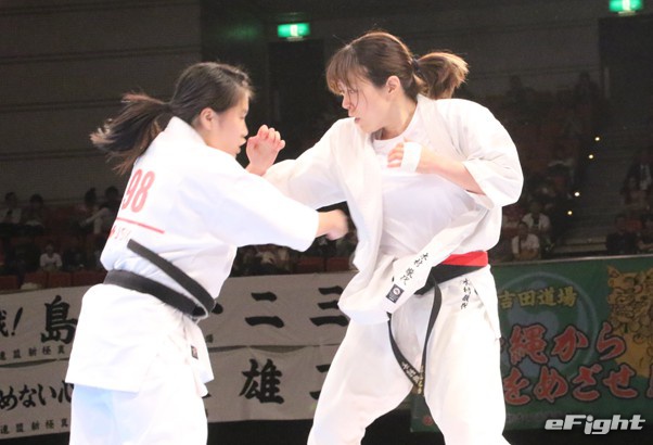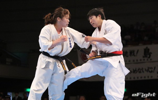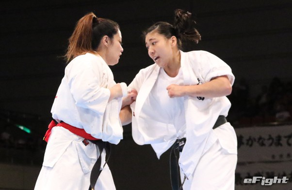 菊川(左)の強烈な突きに水谷(右)は蹴りで対抗