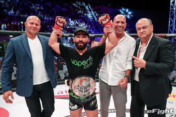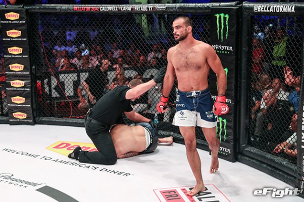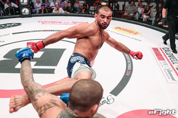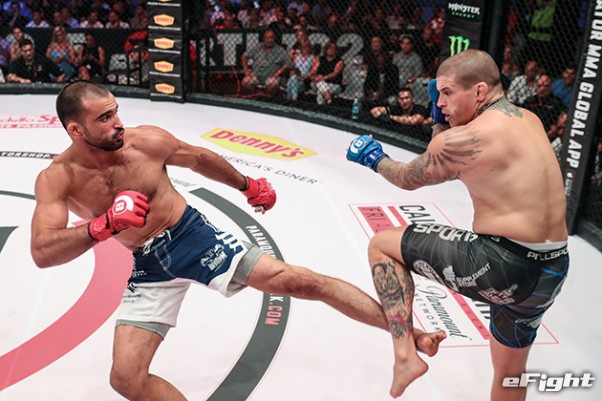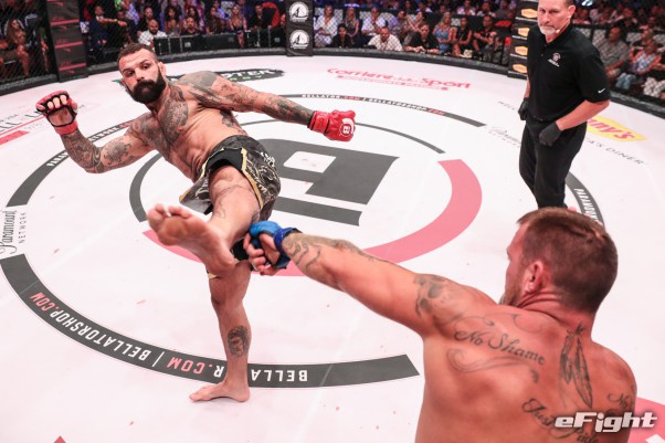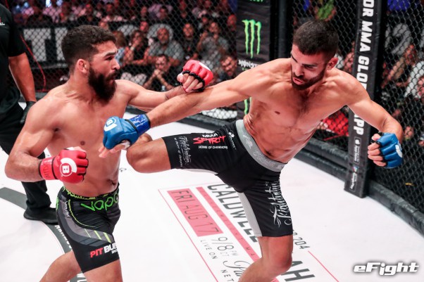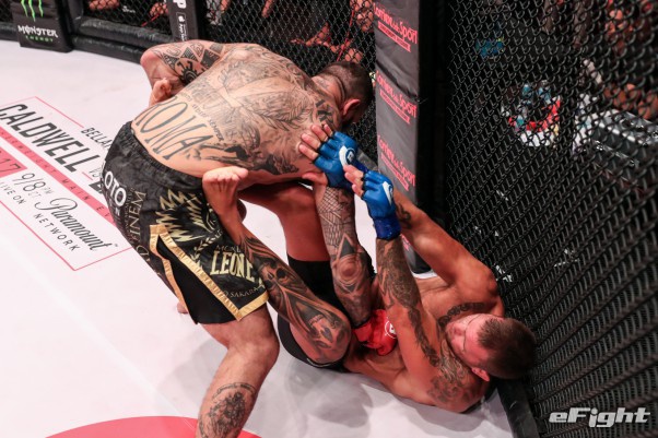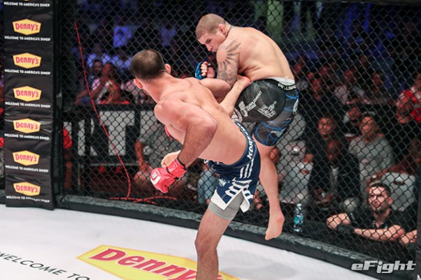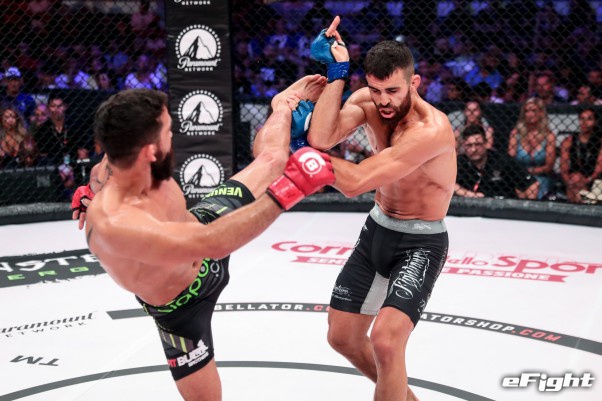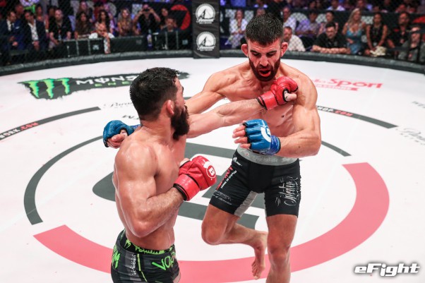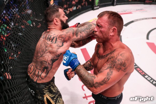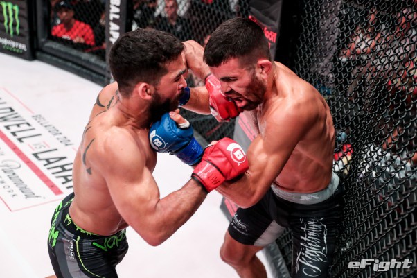 至近距離からのパンチで畳み掛けるパトリシオ(左)