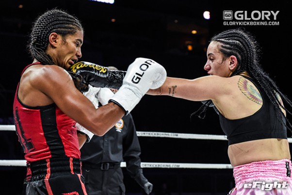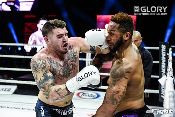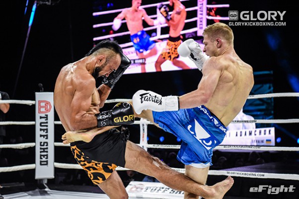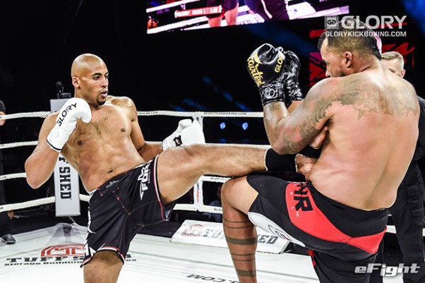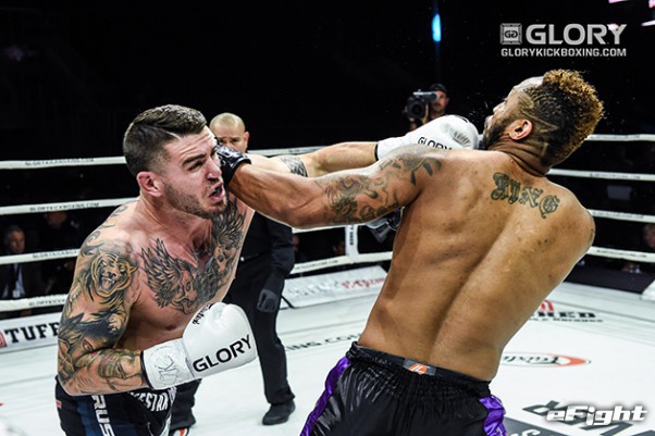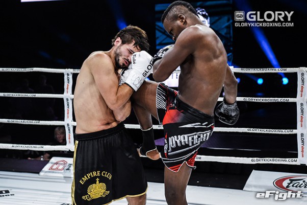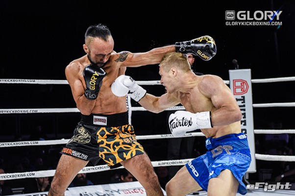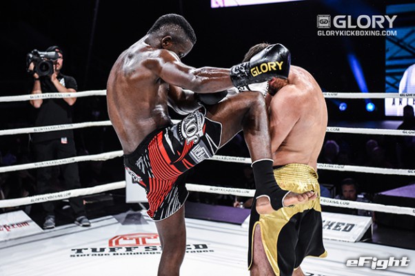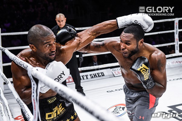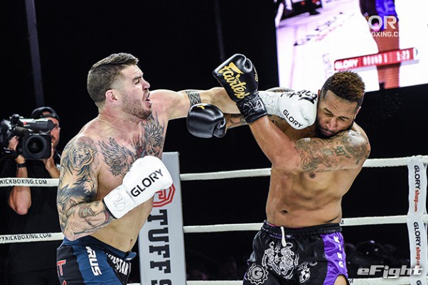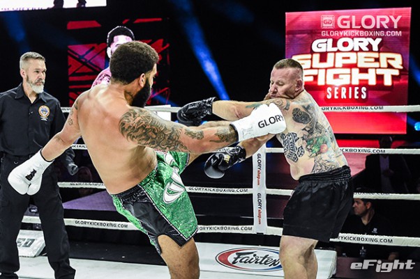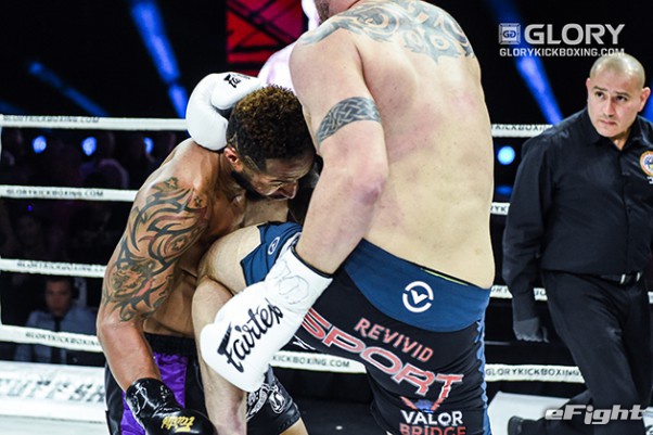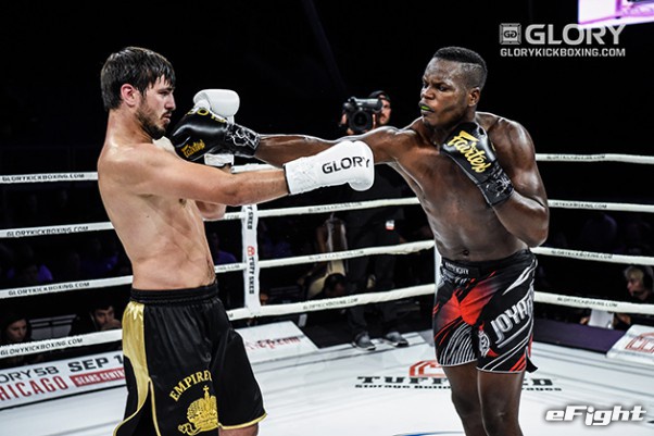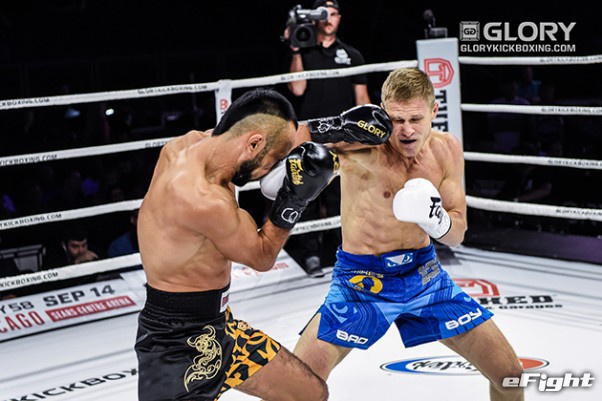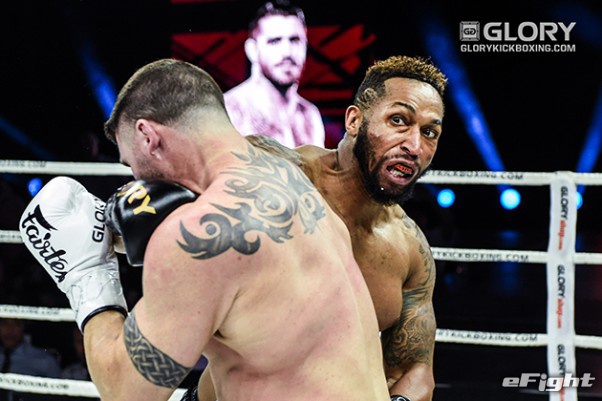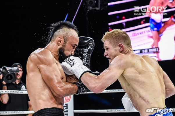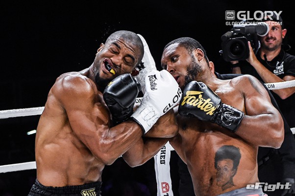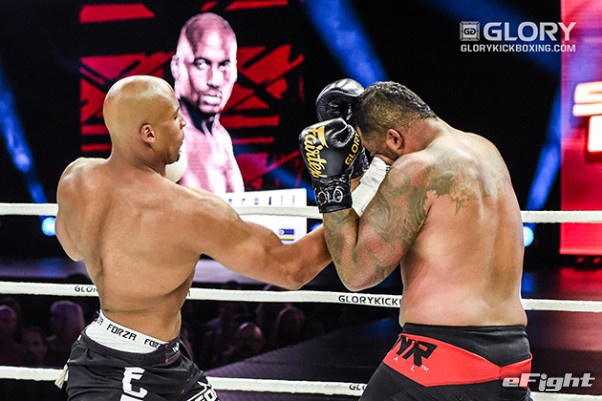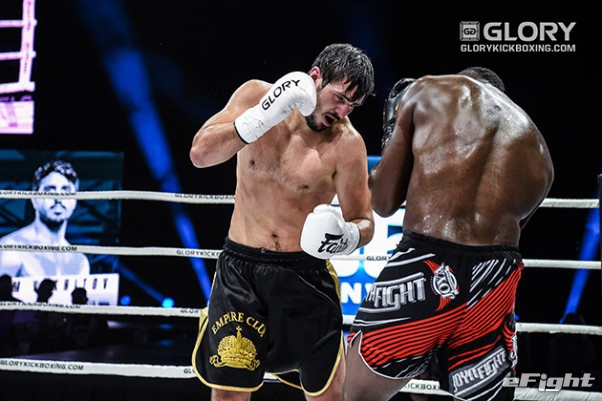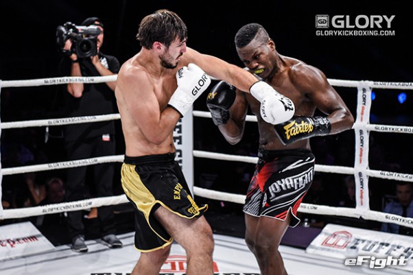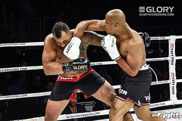 イルンガ(右)にパンチを押し込まれるヴァキトフ(左)