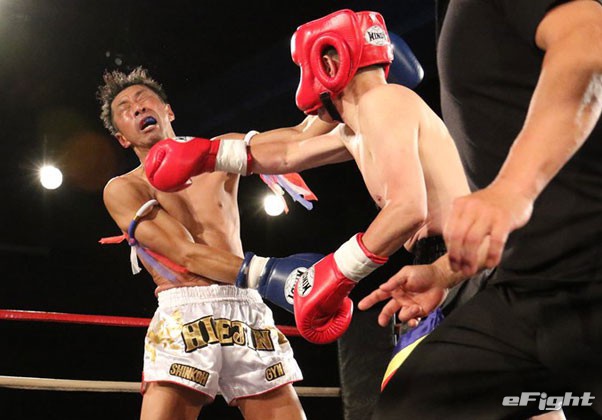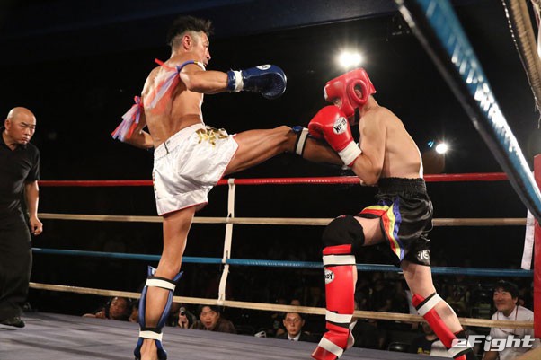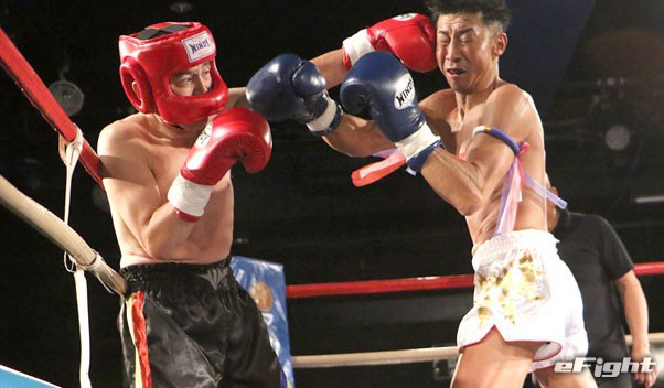 2R、膝蹴りで仕掛けるHIDE(左)に飛鳥(右)が右ストレートで反撃