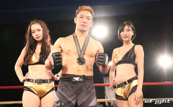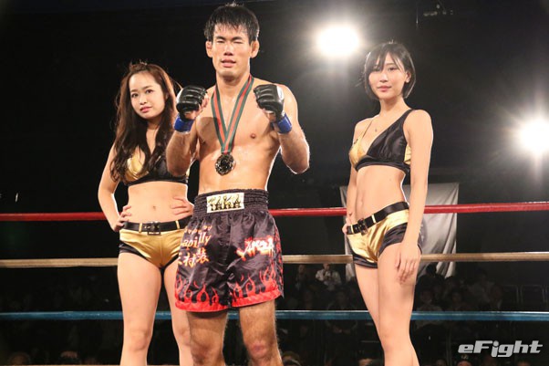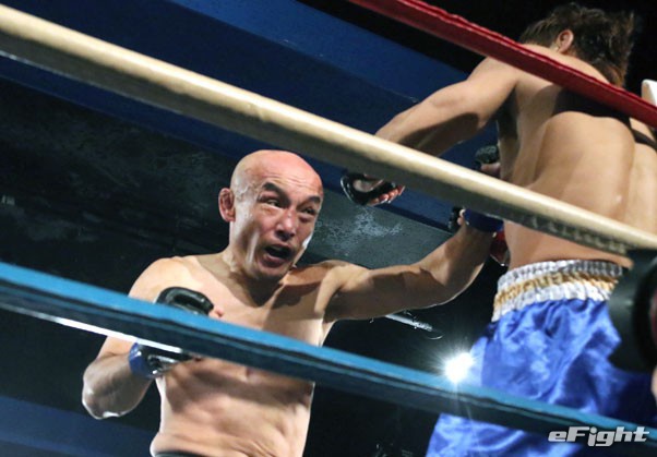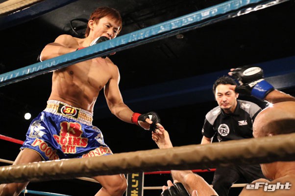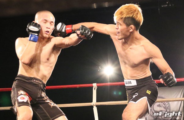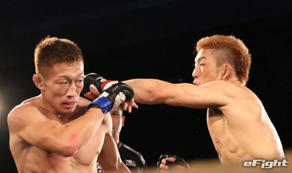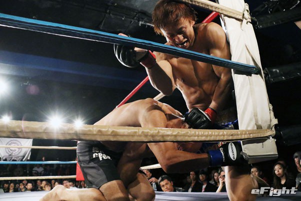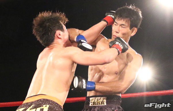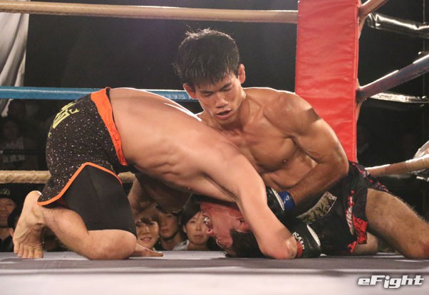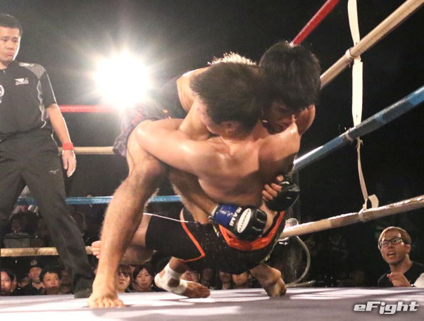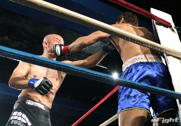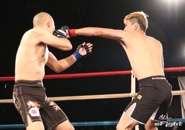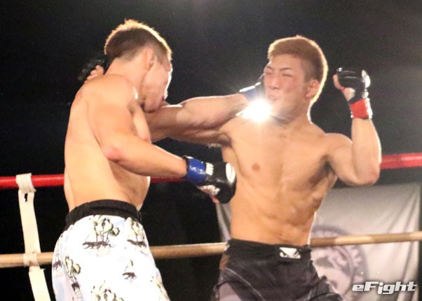 カウンターのヒジ打ちを直撃させる高橋(右)