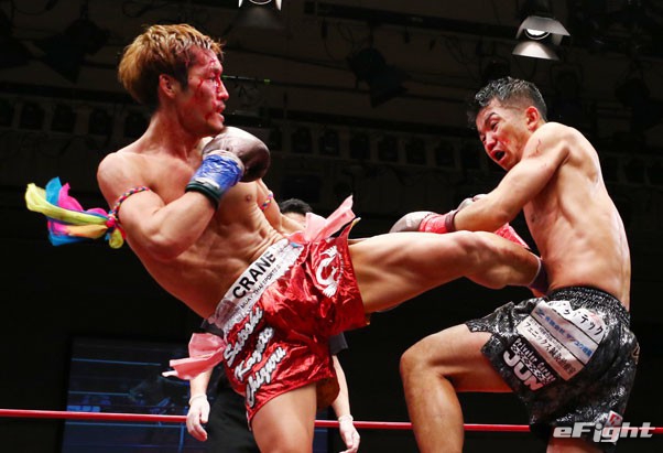 強烈な左ミドルを蹴る片島(左)が、炎出丸(右)を返り討ちにした
