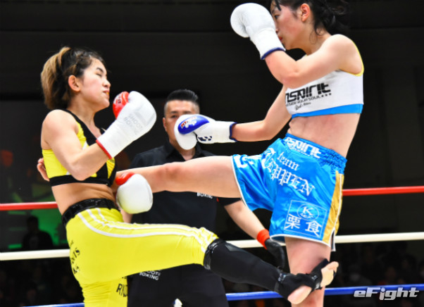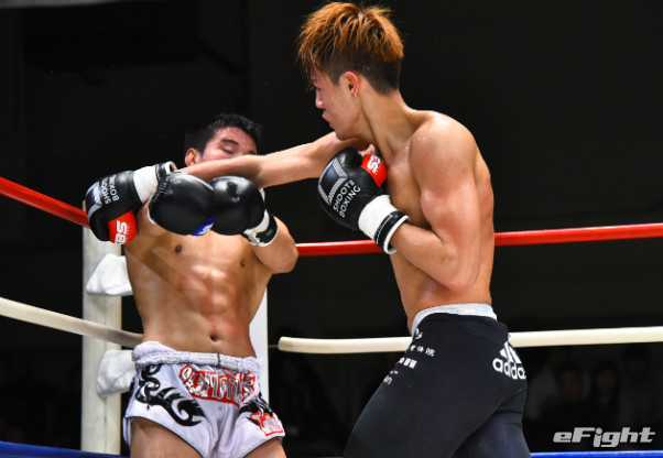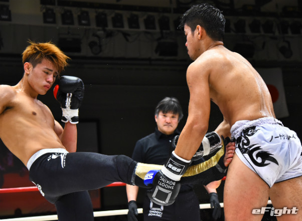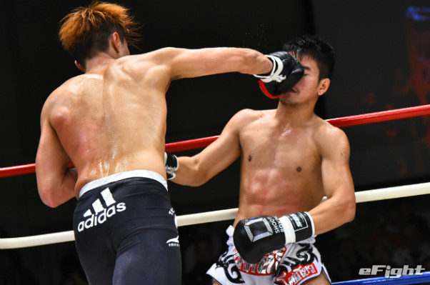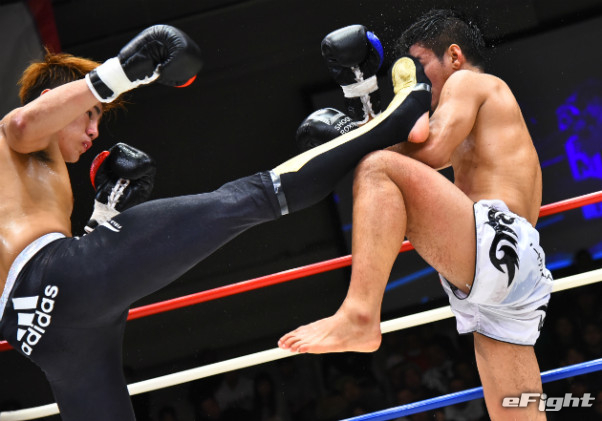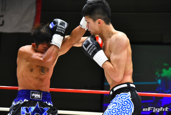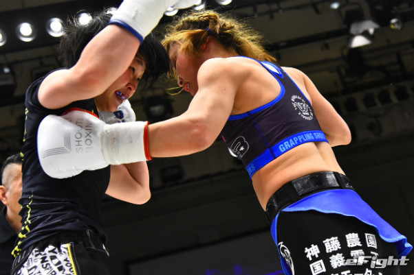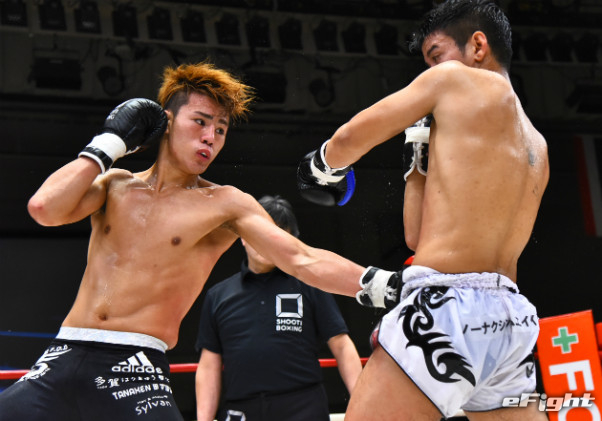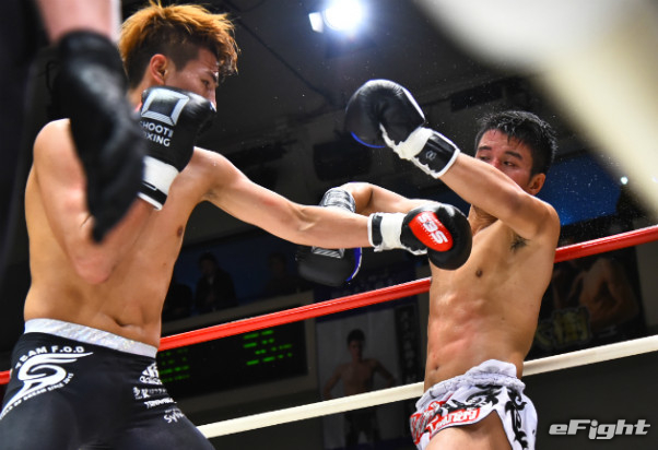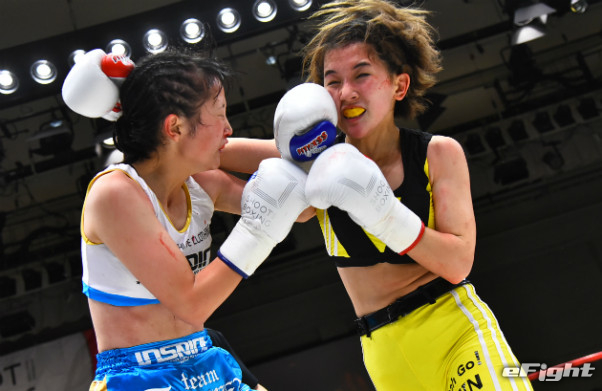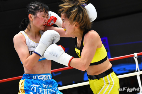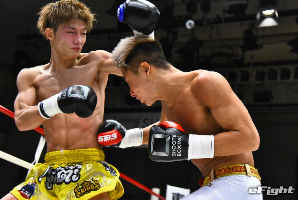 寺山(左)に右ストレートをクリーンヒットさせたMIO(右)