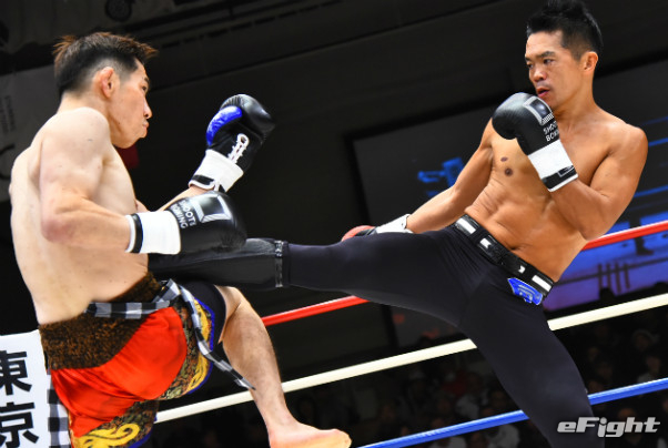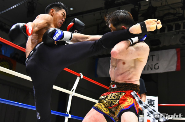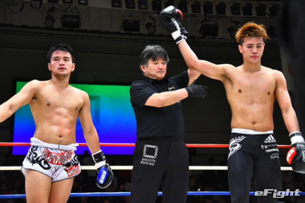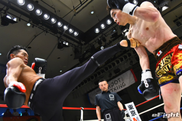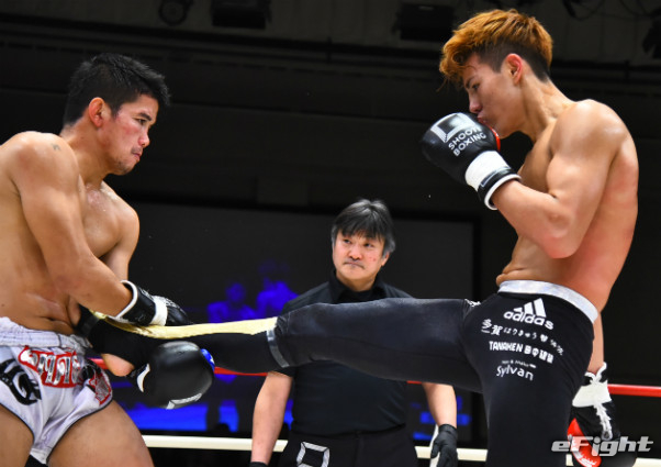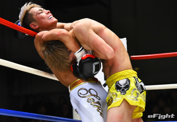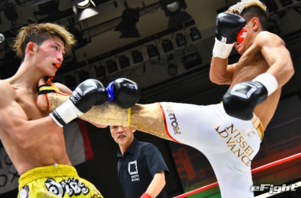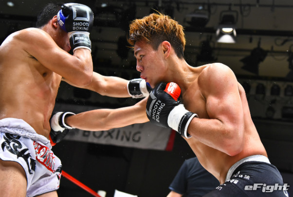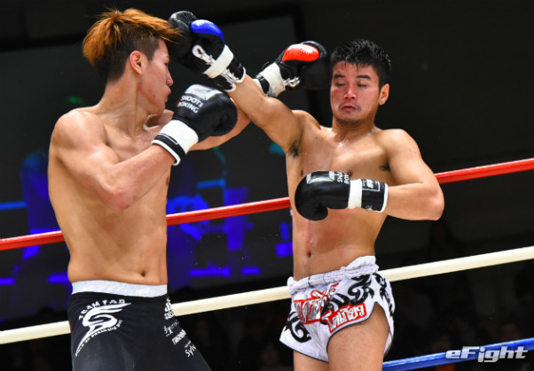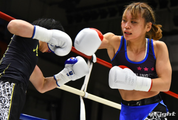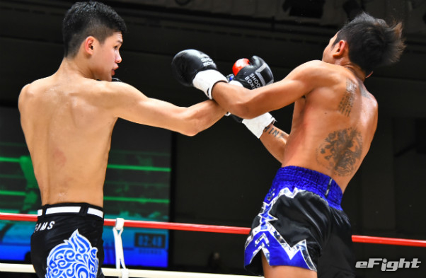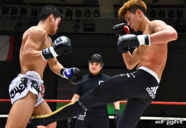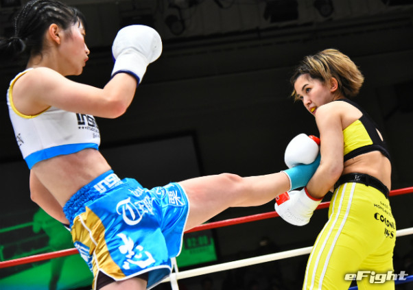 寺山(左)に右ストレートをクリーンヒットさせたMIO(右)