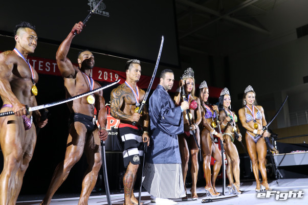 プロ資格を獲得した男子受賞者とともに。中央の着物姿はマッスルコンテスト・インターナショナルのCEOのティマー・エル・グインティー氏