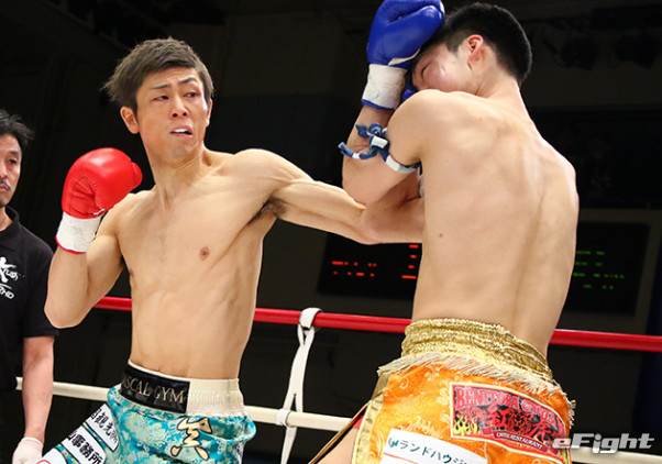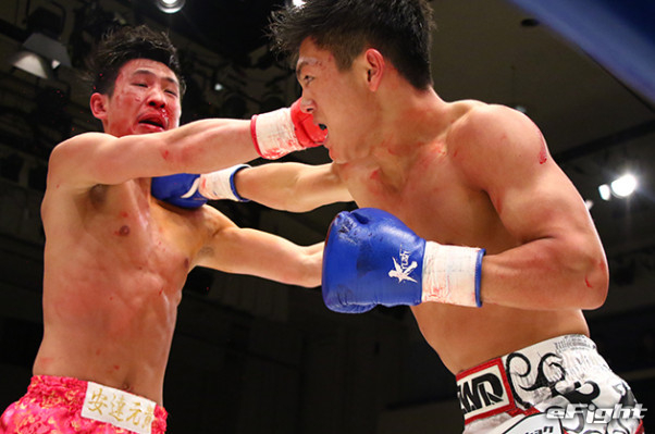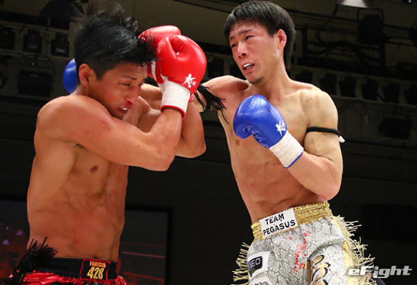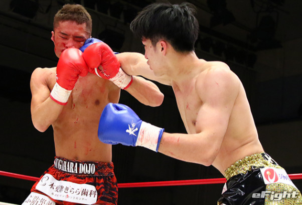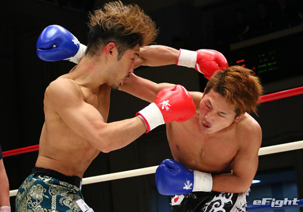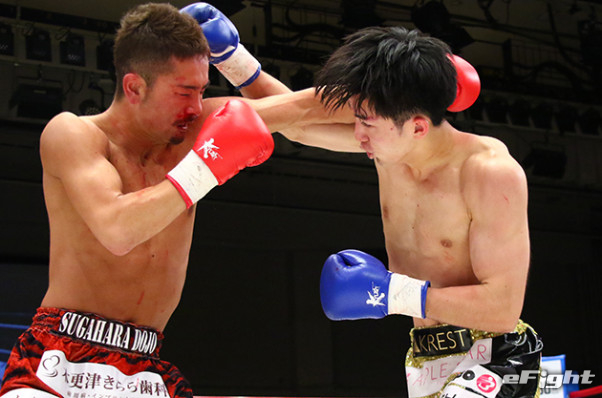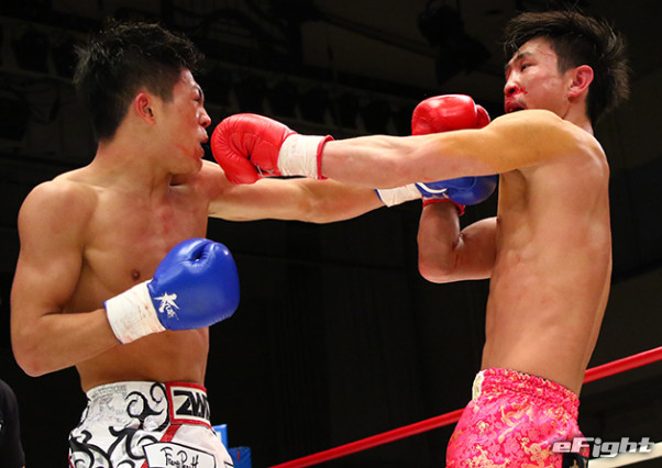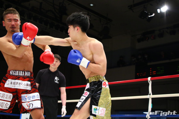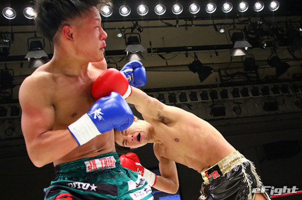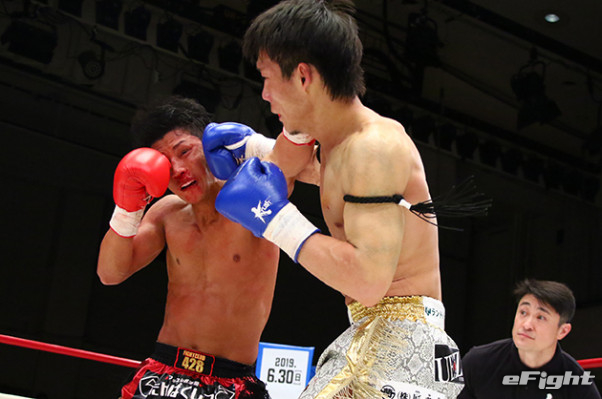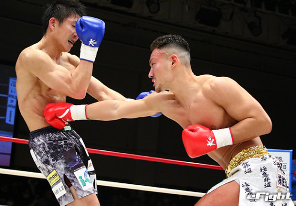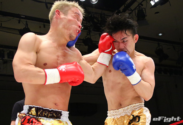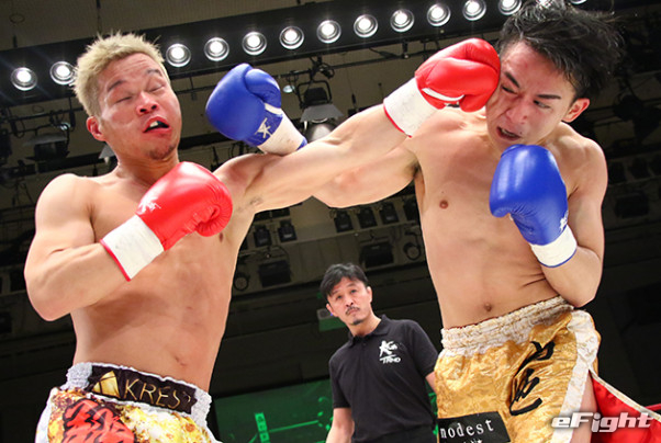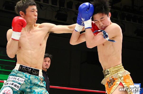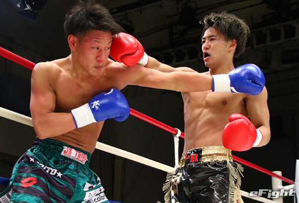 藤村(左)に右ストレートをヒットさせた神保(右)