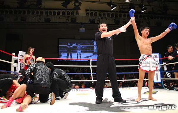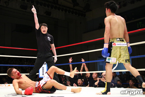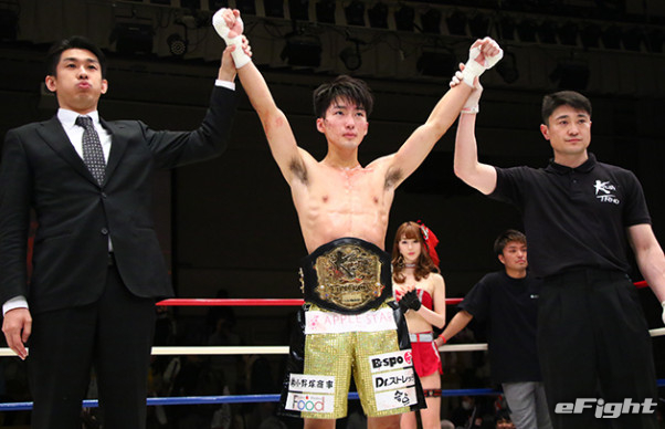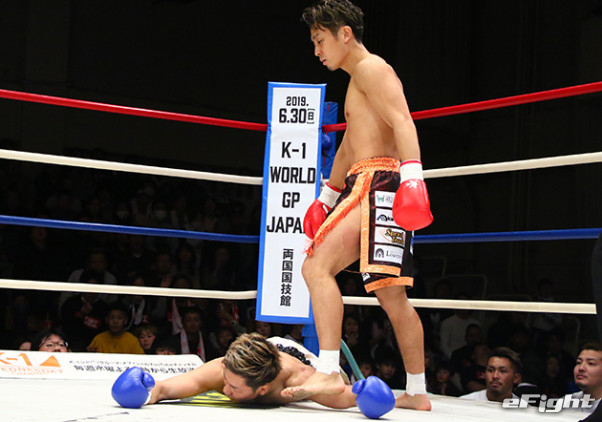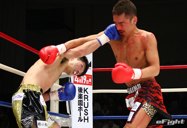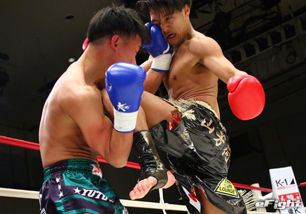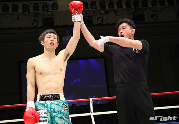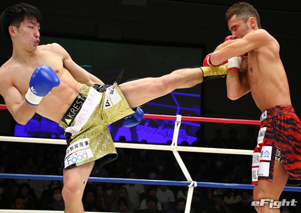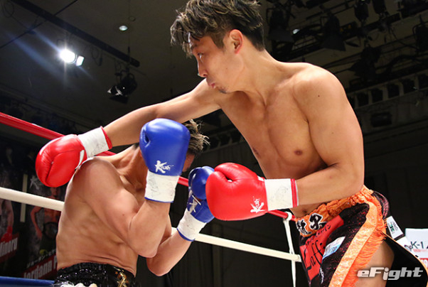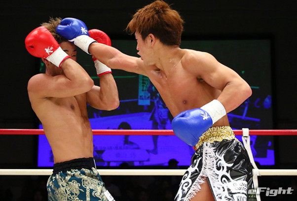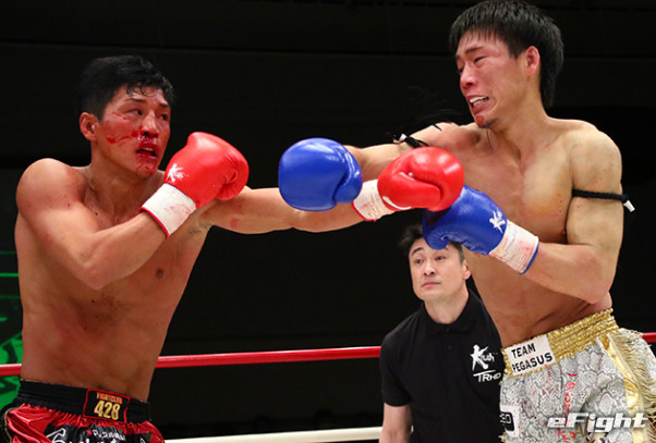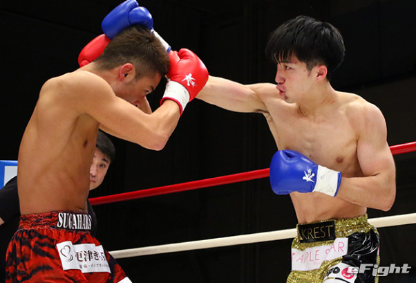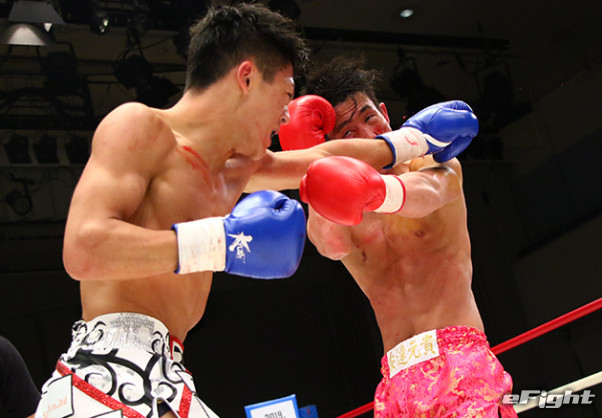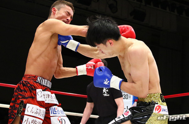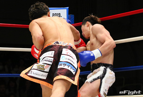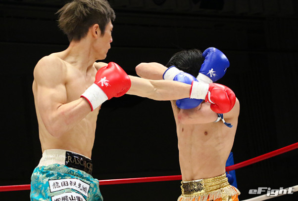 藤村(左)に右ストレートをヒットさせた神保(右)
