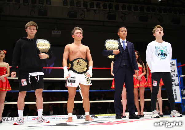 6月のK-1で世界トーナメントに望む玖村将史(左)、晃貴(左から2番目)
