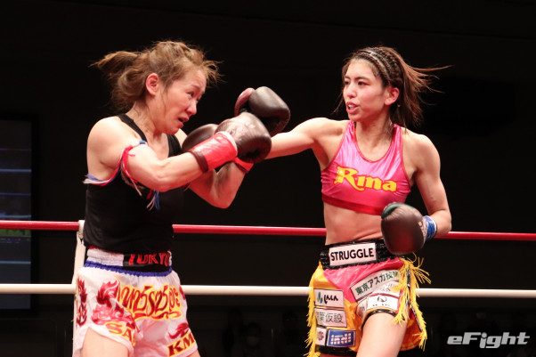 プロ初KOを目指しSae_KMGを攻め立てるぱんちゃん璃奈(右)
