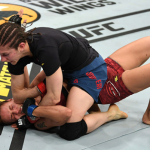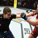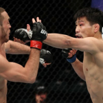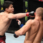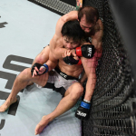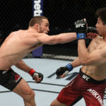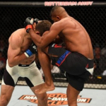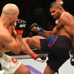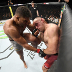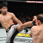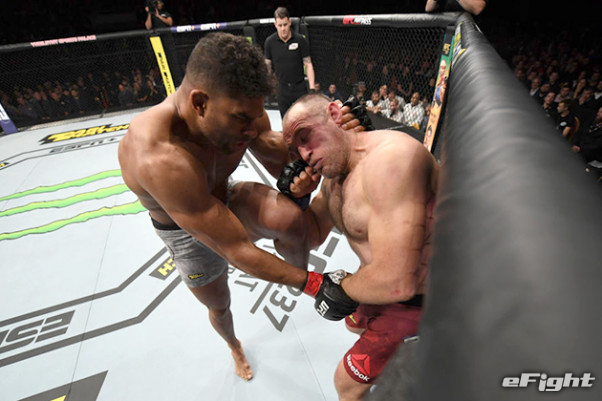 ケージを背負ったオレイニク(右)の顔面をヒザ蹴りで狙うアリスター(左)