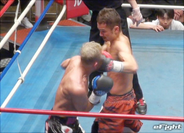 左フックをクリーンヒットさせる島野