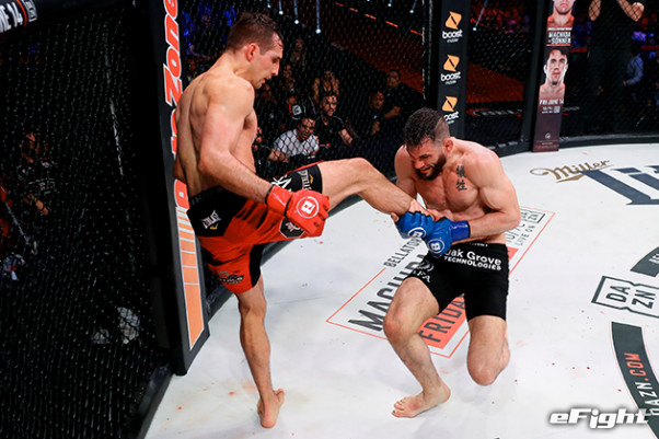 マクドナルド(左)の蹴りをキャッチして食らいつくフィッチ(右)