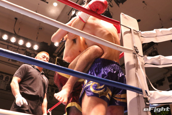 安達(左)の組みヒザが日畑の体力を削り続ける