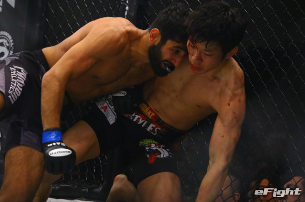グラウンドで斎藤(右)を押さえ込み、優位に試合を進めたサルダリ(左)