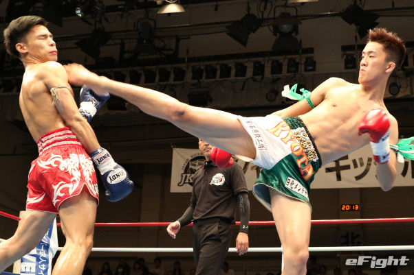 長身から繰り出す伸びのある蹴りを見せる馬渡(右)