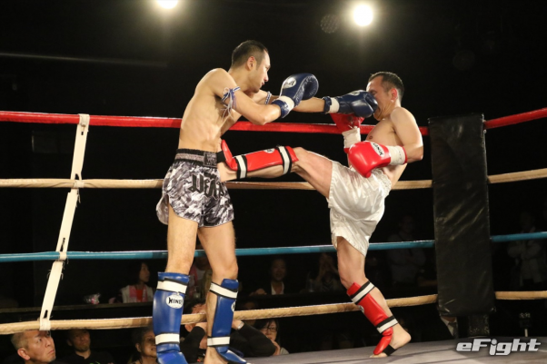 “秋葉原からの刺客”菅野一教(右)の顔面にパンチをヒットさせる“和製サムエー”大津鉄二