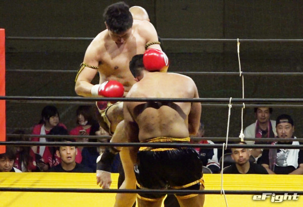 アゴを打ち抜く斐也(左)のヒザでモハメドは崩れ落ちた