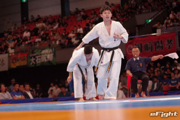芦原会館・大石航輝(右)が右ローで一本勝ち