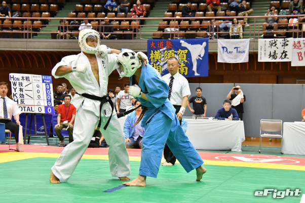 掴みにいく渡部(白)に対し、加藤はカウンターをヒットさせる