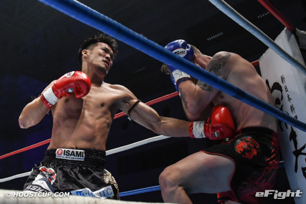 強烈な左ボディを叩き込む大石駿介(左)