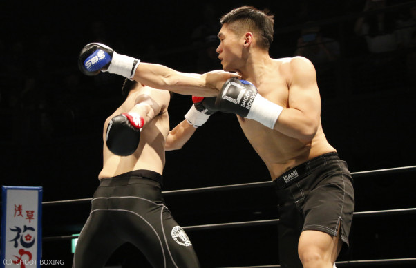 右ストレートから右ハイをクリーンヒットさせ、TKO勝ちした木下翔太